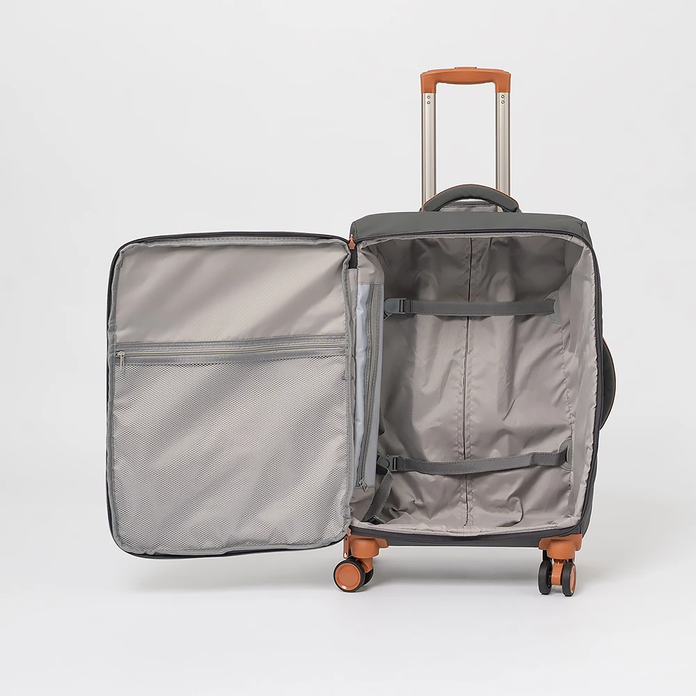 Чемодан-спиннер от бренда Duowang из прочного практичного текстильного материала серого цвета. Модель на четырех пластиковых колесах, с выдвижной ручкой, ручкой-переноской сверху и сбоку. Закрывается клапаном на молнии. Внутри: текстильная подкладка, на крышке — карман-сетка на молнии, в глубоком отделении — ремни для фиксации багажа. На лицевой стороне — два кармана на молнии.