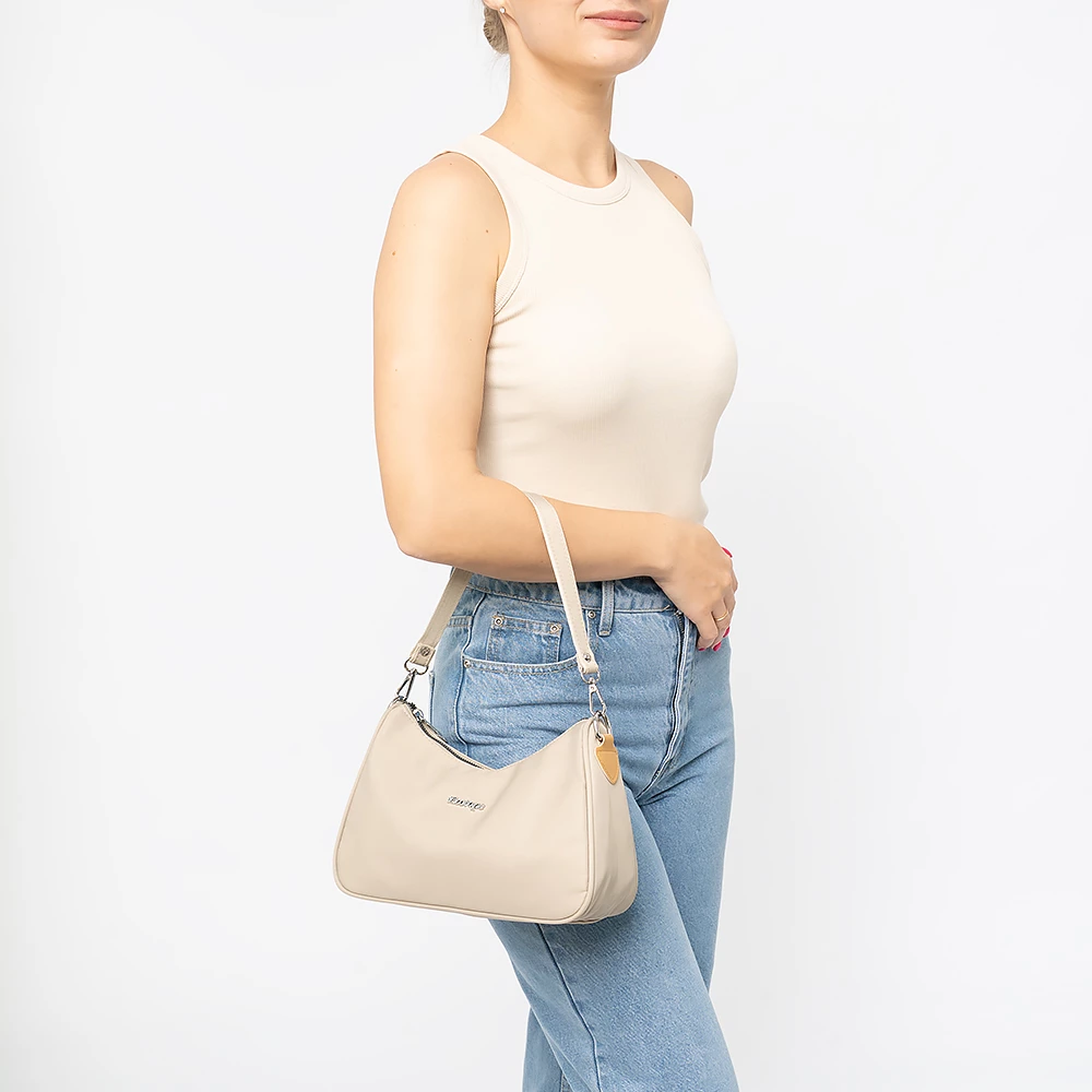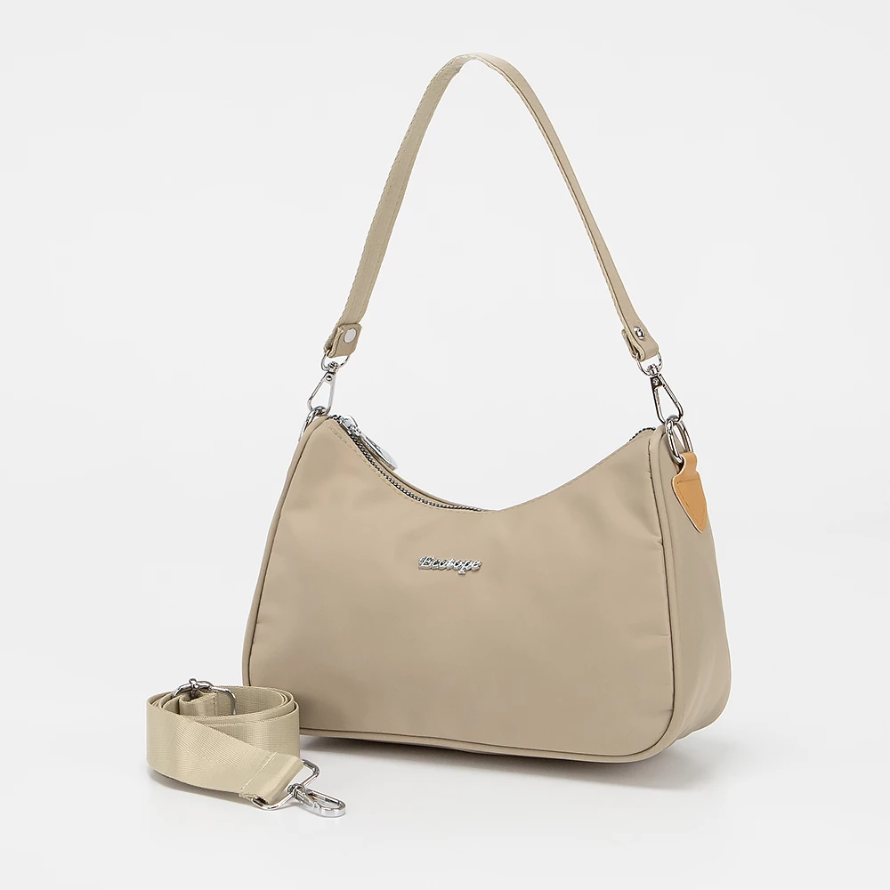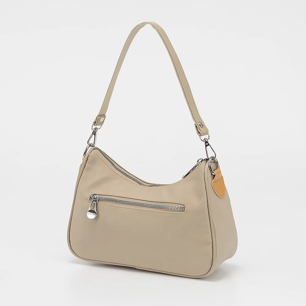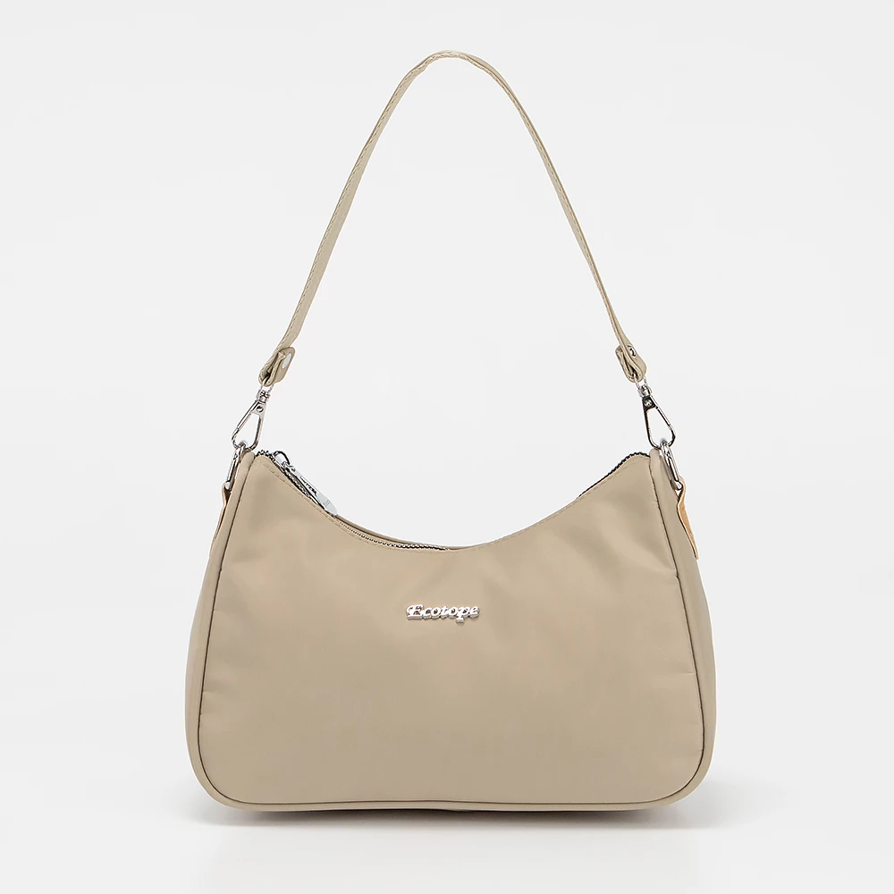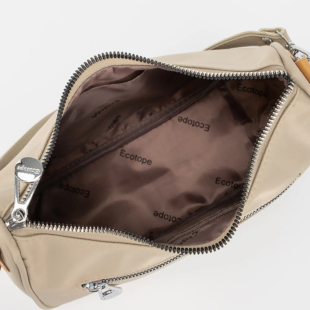 Сумка от бренда Ecotope из практичного текстильного материала бежевого цвета. Модель с длинной ручкой и съемным регулируемым плечевым ремнем. Отделение на молнии, с текстильной подкладкой. Внутри карман на молнии и накладной карман. На задней стороне — карман на молнии.
