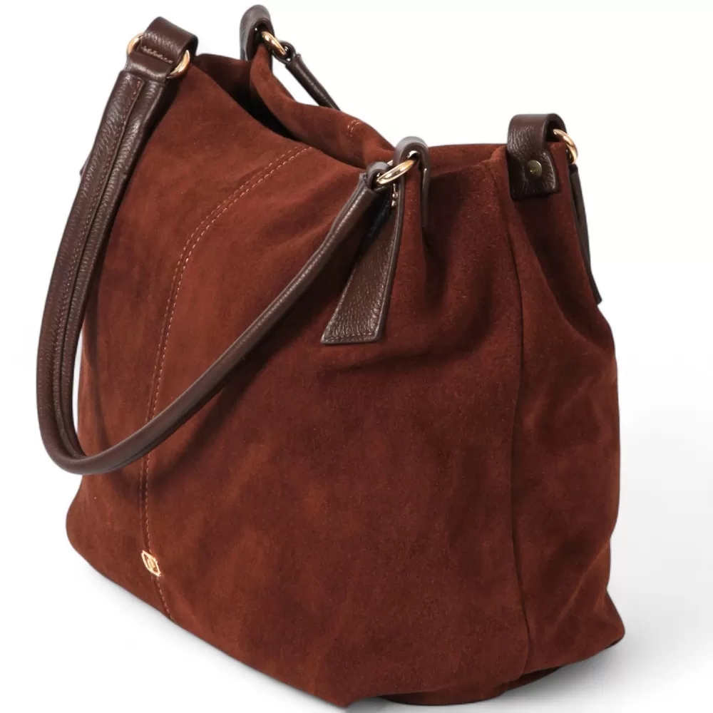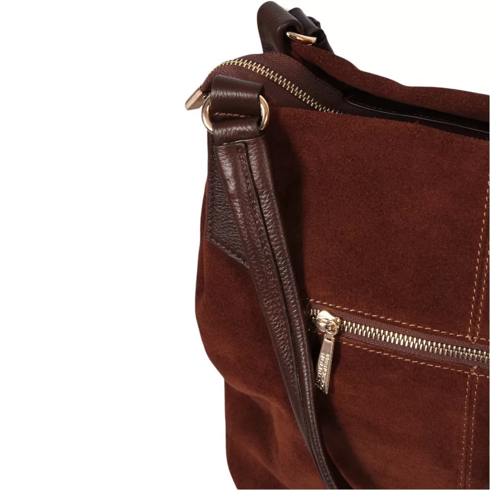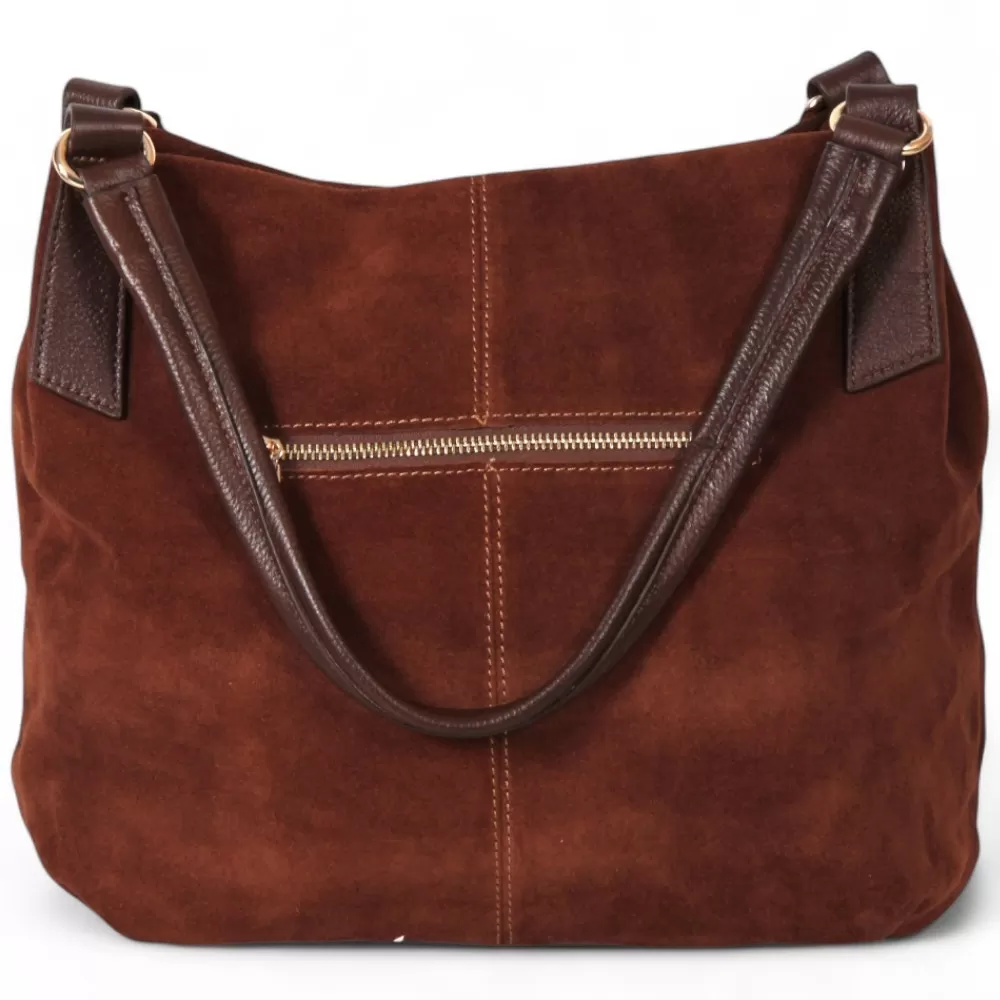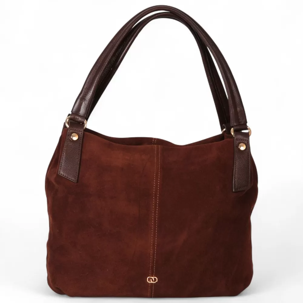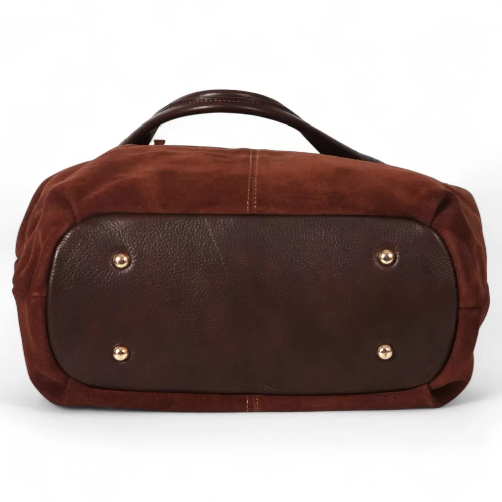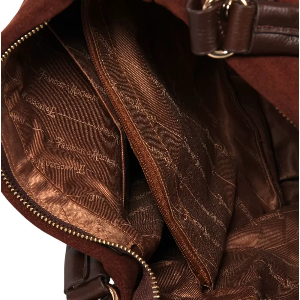 Сумка от бренда Francesco Molinary выполнена из натуральной замши в коричневом цвете. Модель с двумя длинными ручками, на задней стороне расположен горизонтальный карман быстрого доступа на молнии. Сумка с одним основным отделением, внутри: фирменная текстильная подкладка, накладной открытый карман, карман посередине на молнии и боковой карман на молнии. Сумка оснащена металлическими ножками, которые предотвращают её износ и защищают от загрязнений.