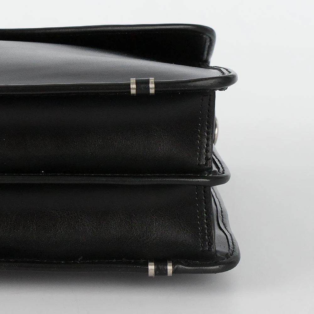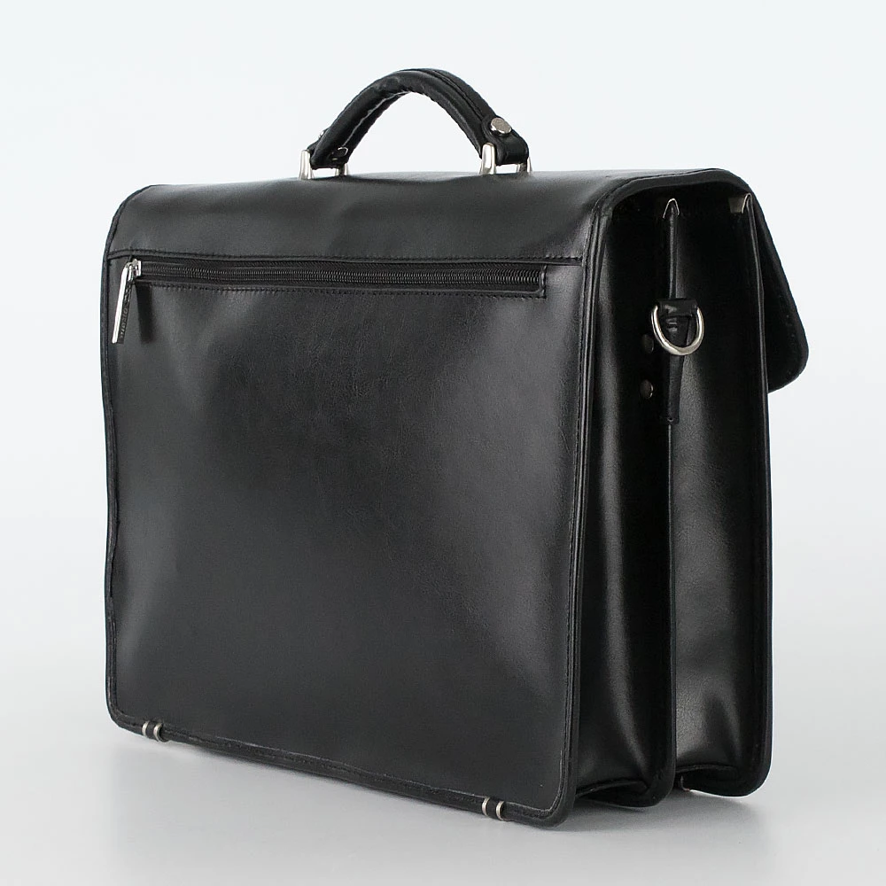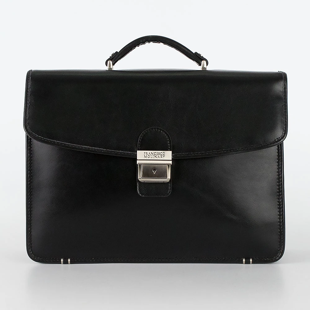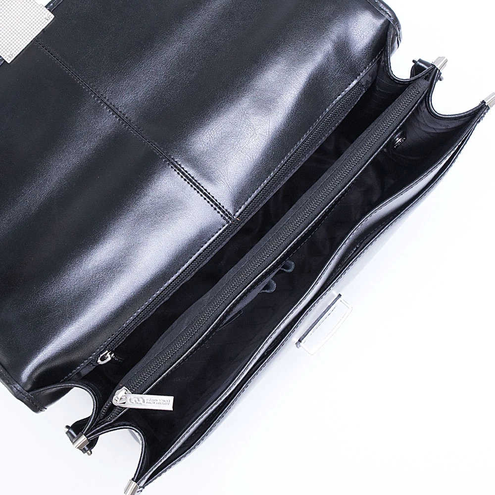 Классический мужской портфель от бренда Francesco Molinary из натуральной кожи черного цвета. Модель имеет два отдела с текстильной отделкой, разделенных средником на молнии, закрывается на крышку с серебристым металлическим замком-щеколдой. Внутри несколько прорезных карманов под молнией и накладных карманов без застежки, карман на молнии с задней внешней стороны. Фурнитура и ножки на дне портфеля металлические серебристого цвета. В комплекте съемный регулируемый кожаный ремень на плечо.