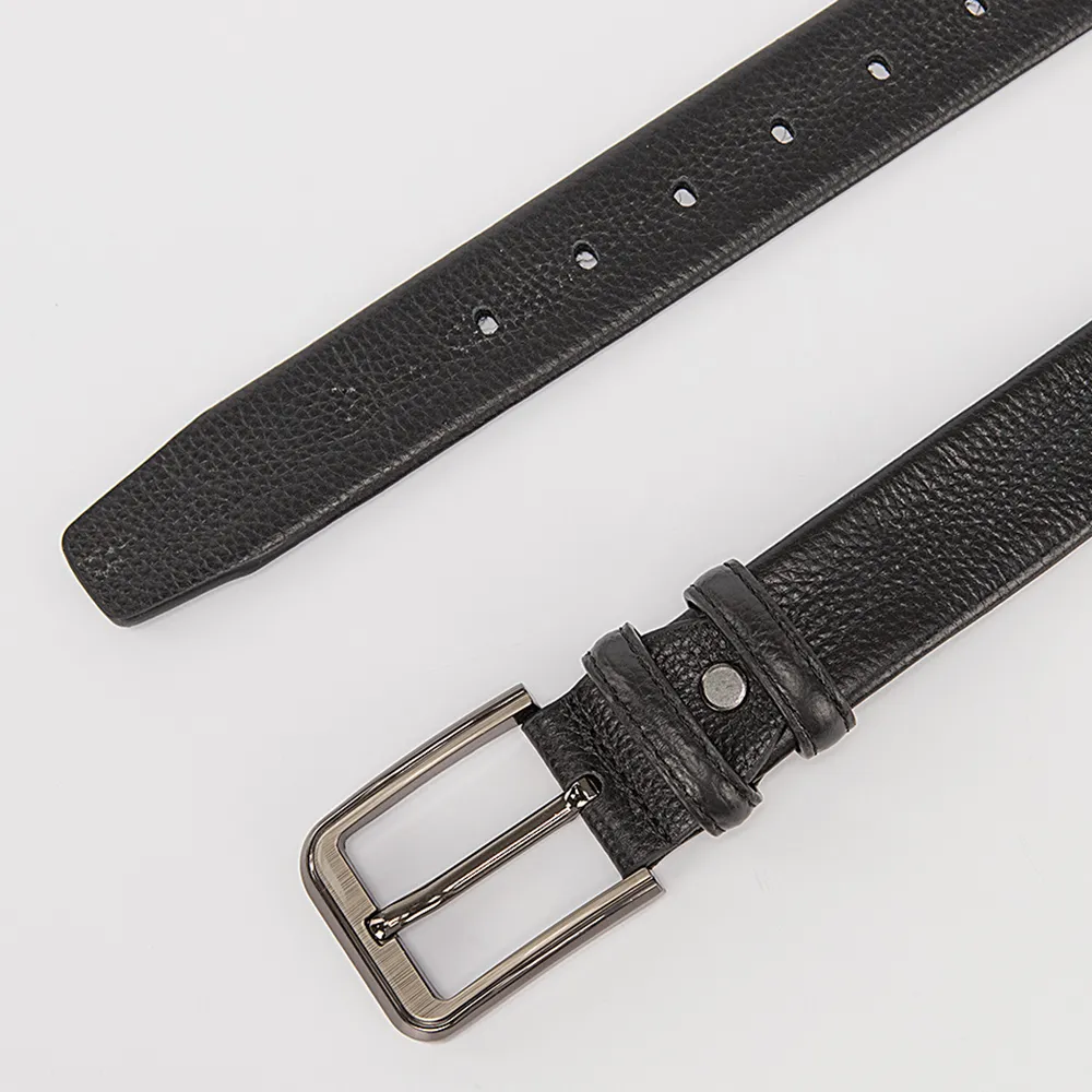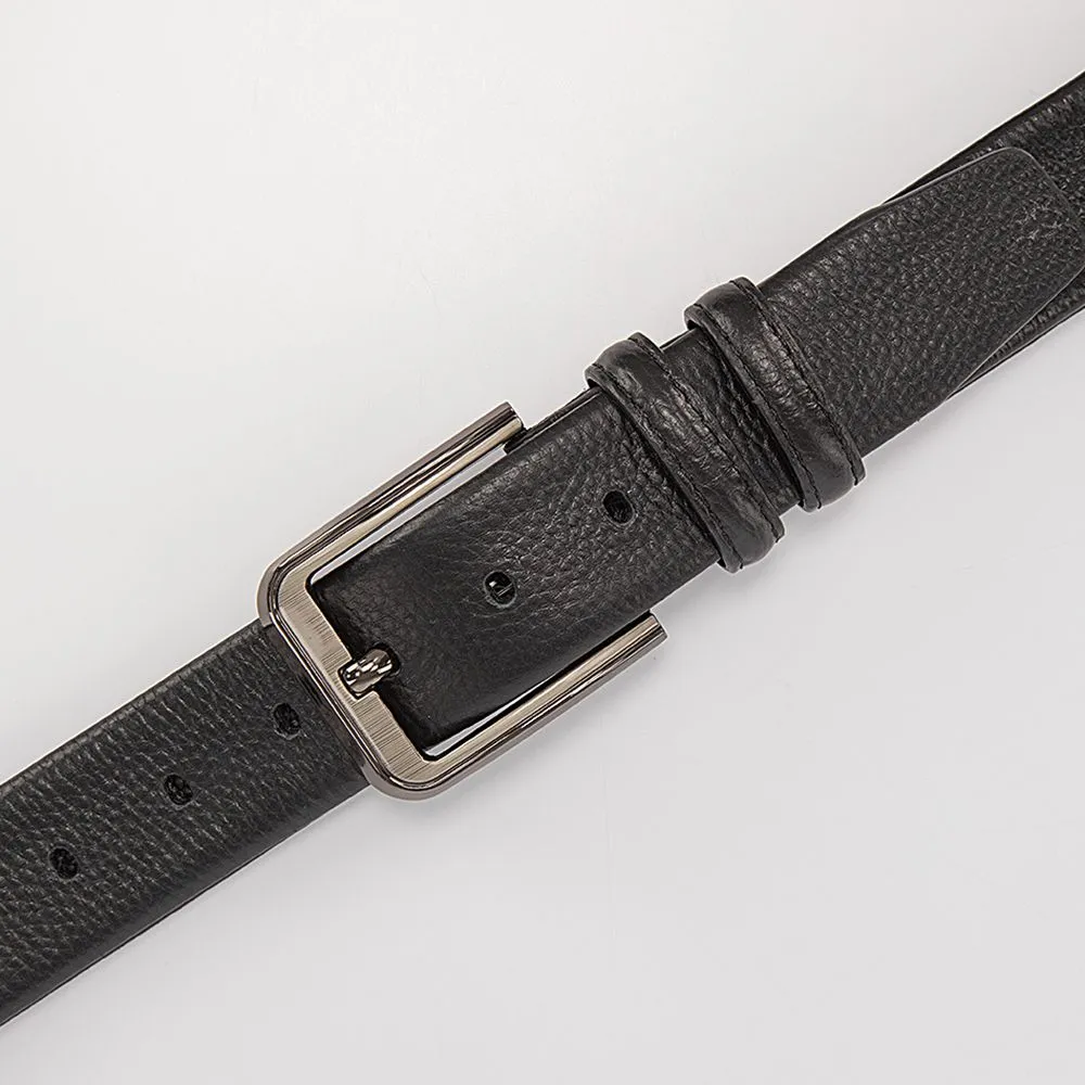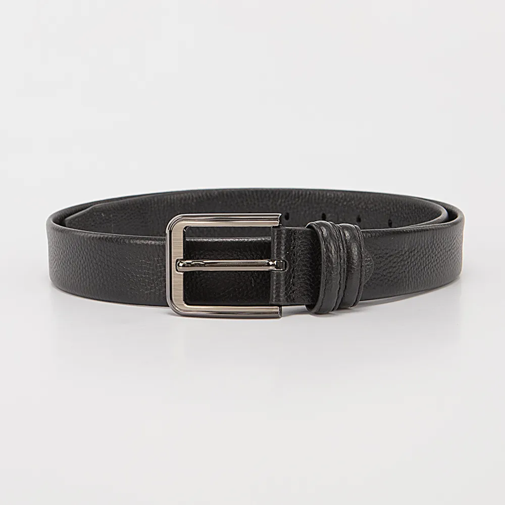 Классический брючный ремень от Poshete выполнен из натуральной мягкой кожи черного цвета. Модель с открытой серебристой пряжкой и двумя кожаными шлевками.