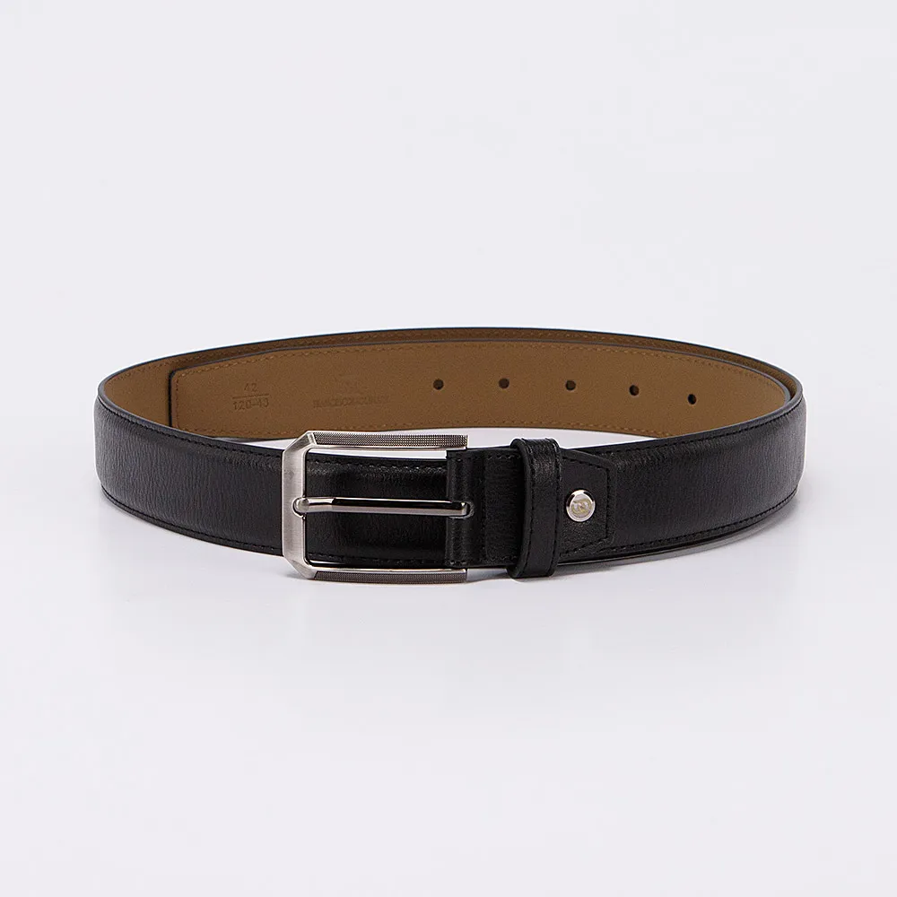 Кожаный ремень от Francesco Molinary украшен металлической матовой пряжкой с тиснением. Ремень имеет чёрный матовый цвет, с оборотной стороны светлый. Оснащён кожаной шлёвкой для дополнительной фиксации с тиснением бренда, на конце ремень трапециевидной формы. Подойдёт к любым брюкам. Модель длиной 105-110 см и шириной 3,3 см.