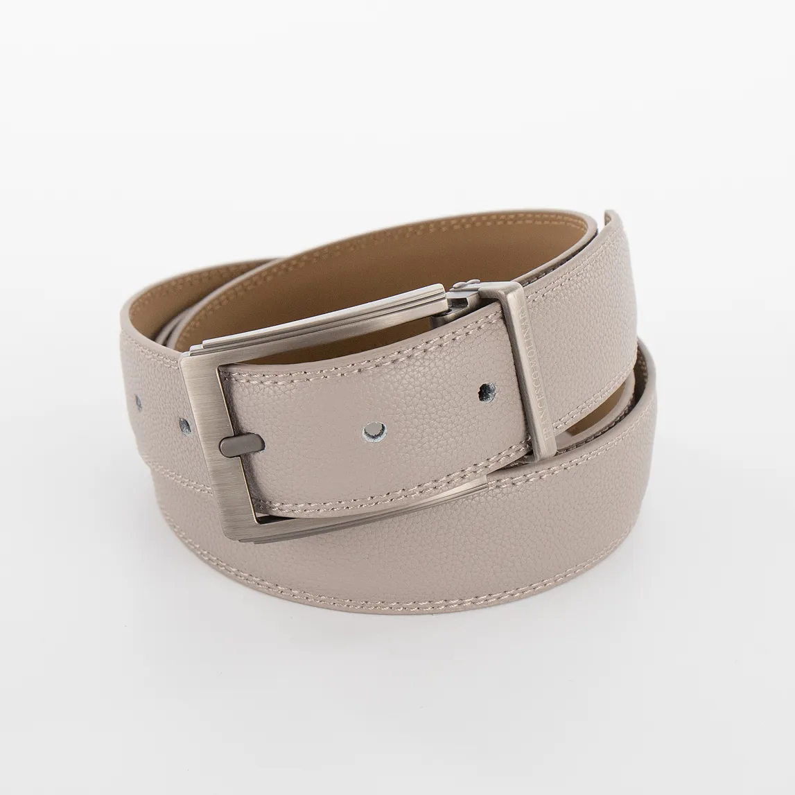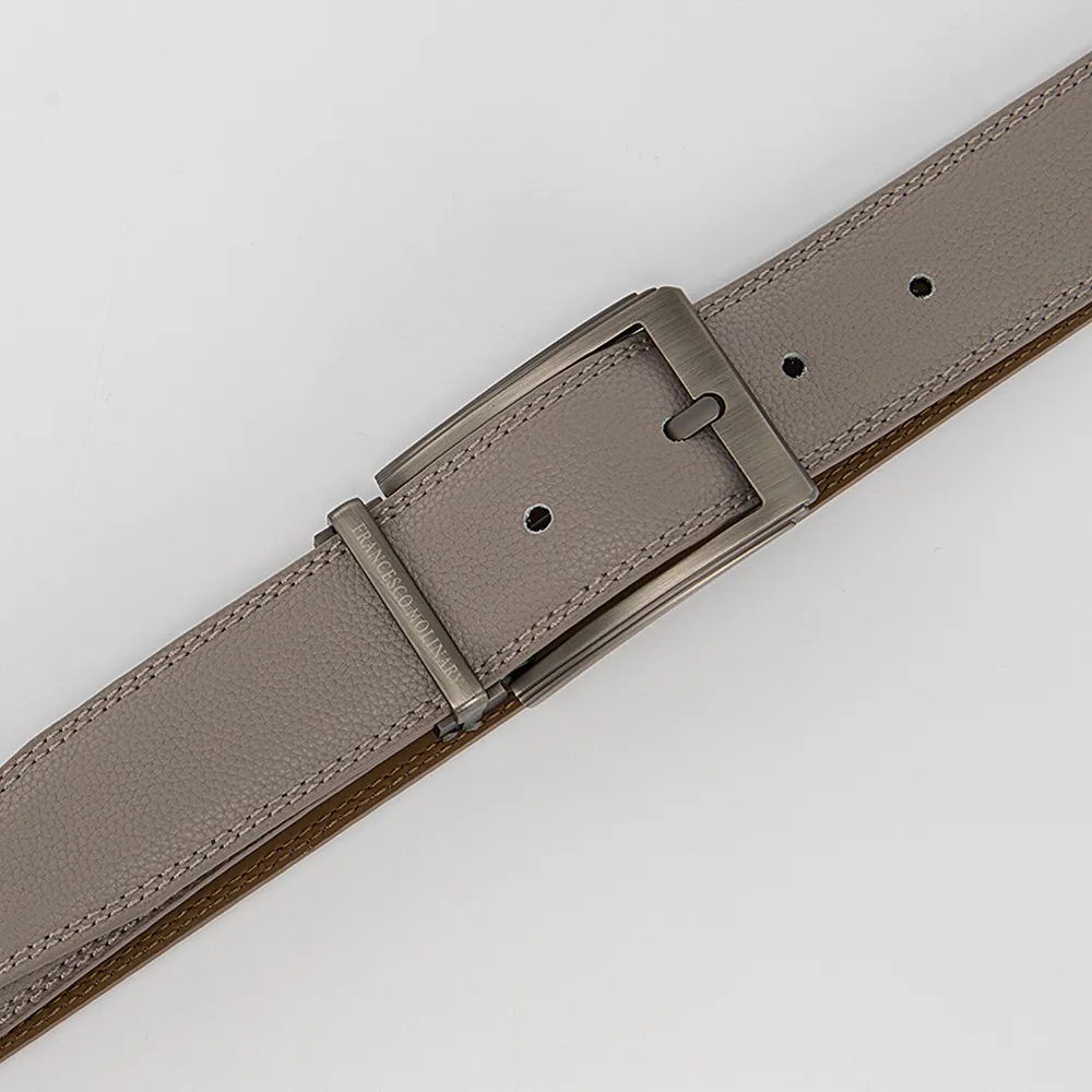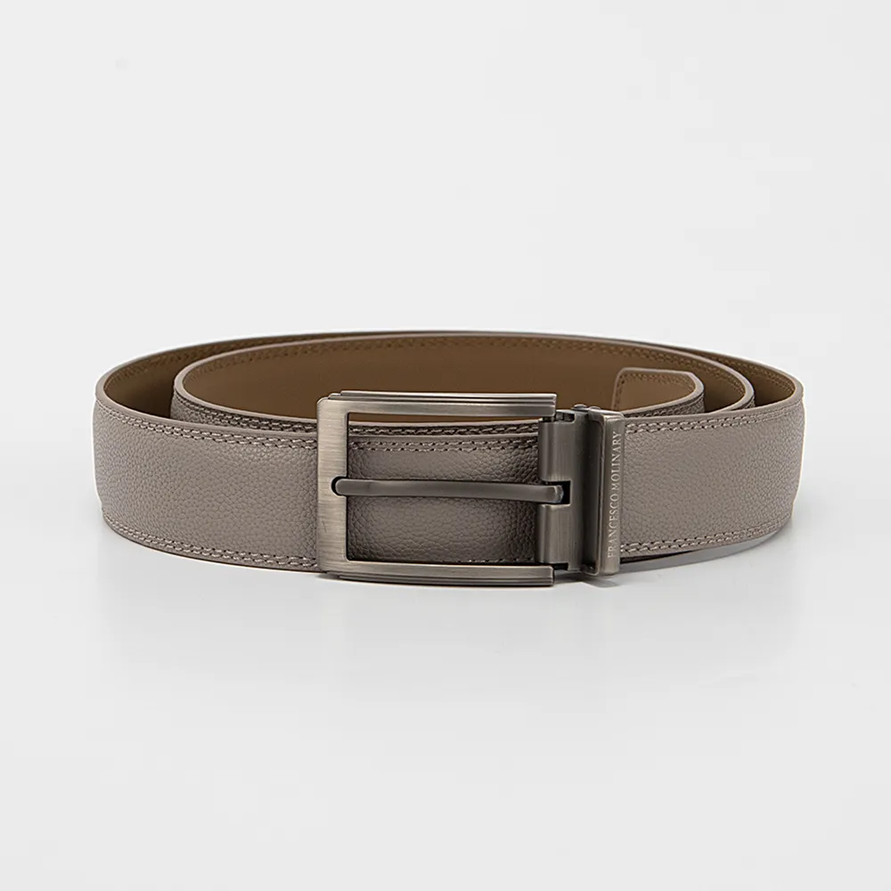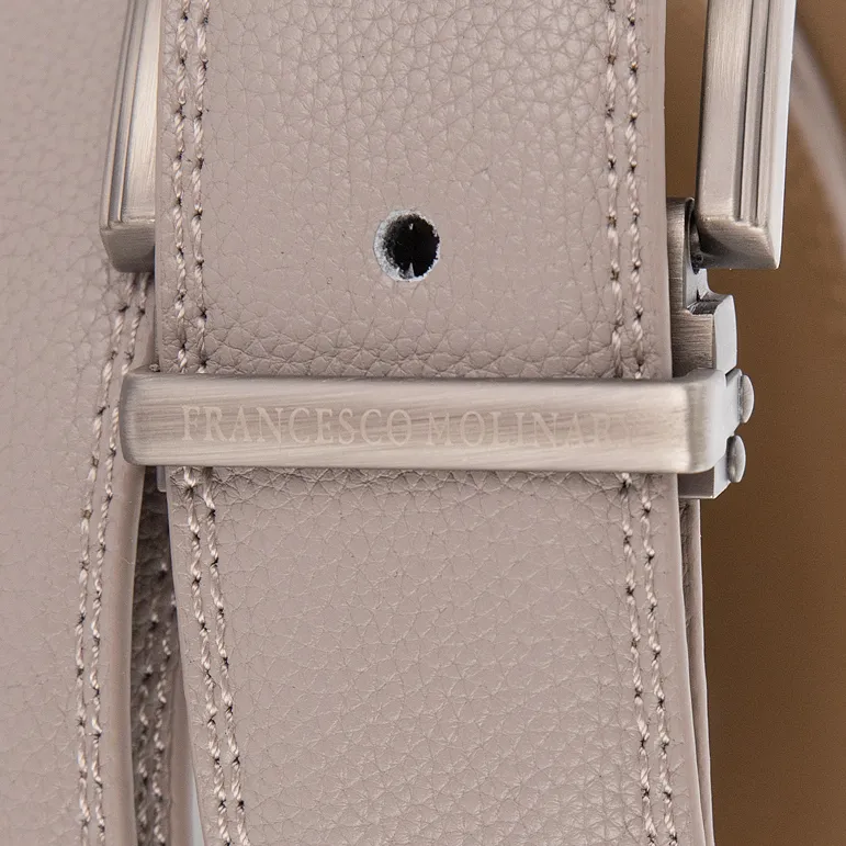 Мужской ремень от торговой марки Francesco Molinary из натуральной кожи светло-серого цвета. Модель с металлической пряжкой и шлевкой, двойной строчкой по краям; ширина: 3,3 см, длина: 105-110 см.