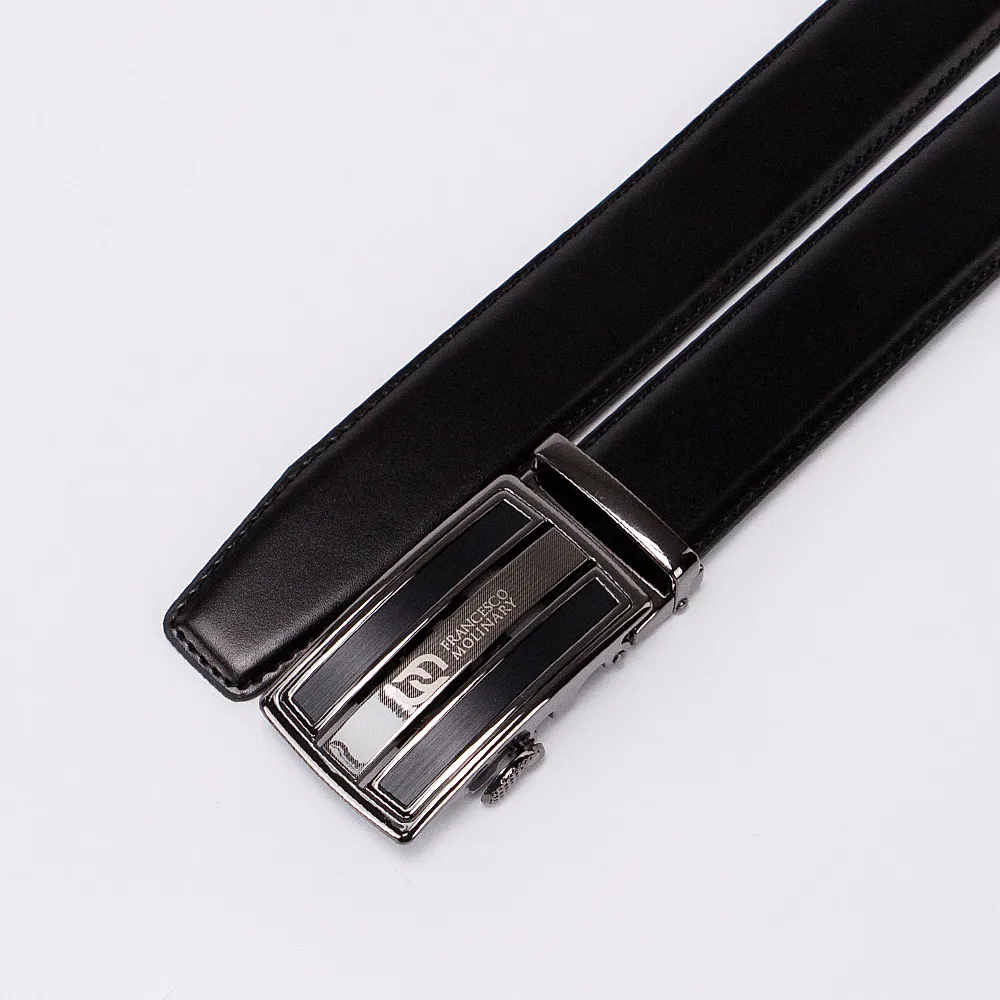Незаменимый аксессуар в гардеробе каждого мужчины это ремень с пряжкой автомат. Модель из натуральной мягкой кожи чёрного цвета, пряжка металлическая блестящего чёрного цвета с тиснением логотипа Francesco Molinary. Ремень имеет двойной металлический держатель для дополнительной фиксации, на конце ремень трапециевидной формы. Модель длиной 111-115 см и шириной 3,3 см.