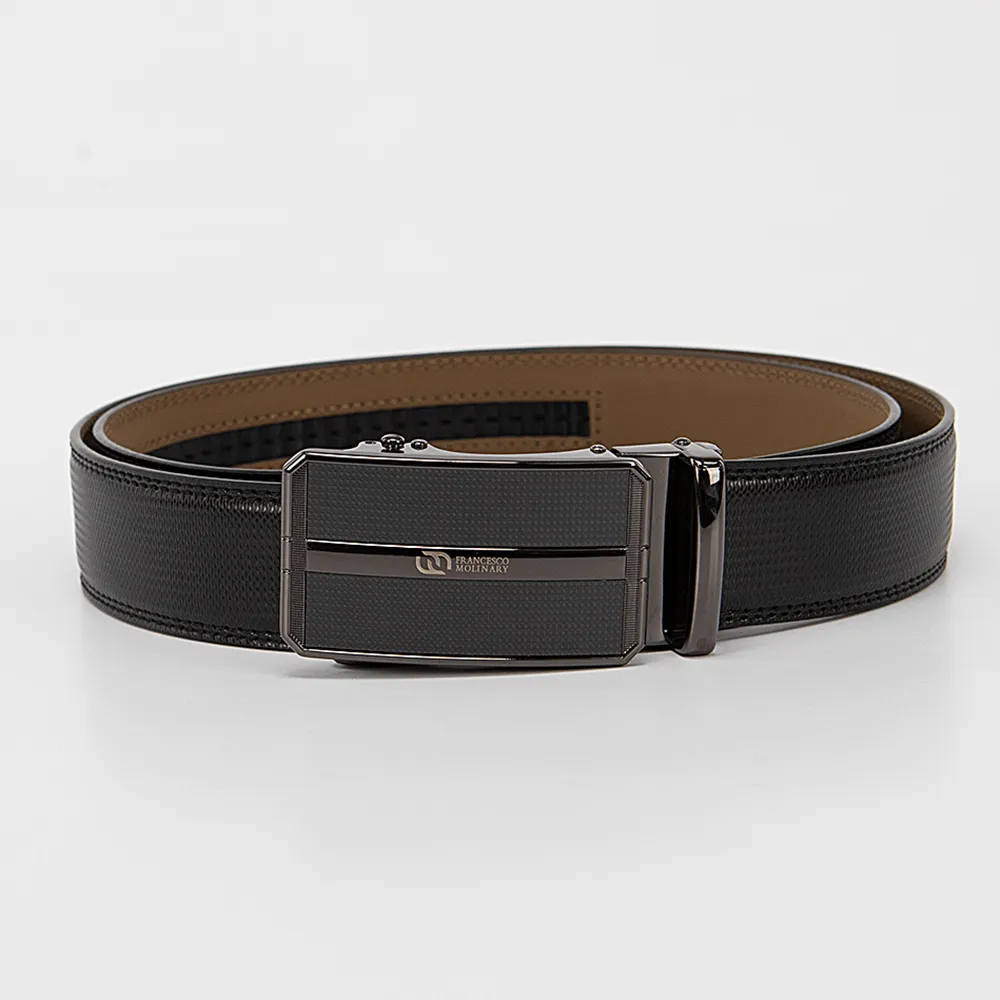 Мужской кожаный ремень от торговой марки Francesco Molinary из натуральной кожи коричневого цвета. Модель с металлической пряжкой-автомат и шлевкой. Ширина: 3,3 см, длина: 111-115 см. Размер: M.