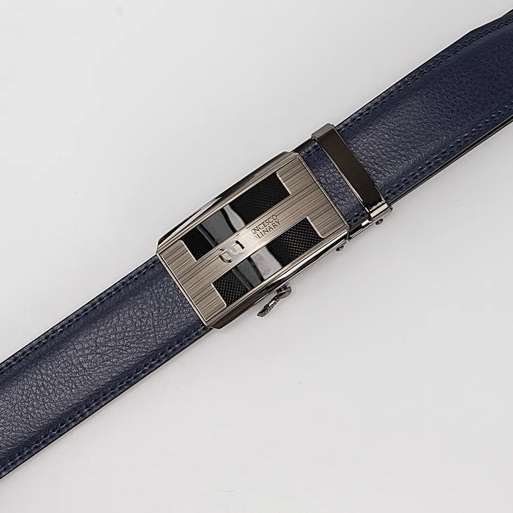 Прочный кожаный ремень прошит двойной строчкой, имеет тёмно-синий цвет и тиснение под крокодила, с оборотной стороны светлый. Подойдёт как к джинсам так и брюкам. Металлическая матовая пряжка автомат с тиснением и гравирована логотипом бренда Francesco Molinary. Ремень имеет металлический держатель для дополнительной фиксации, на конце ремень трапециевидной формы. Модель длиной 105-110 см и шириной 3,3 см.