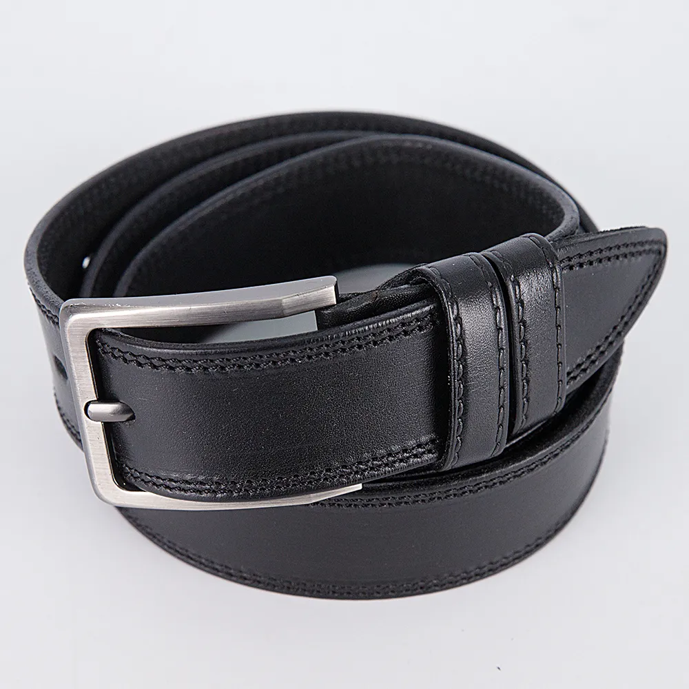 Ремень от торговой марки Poshete из натуральной гладкой кожи черного цвета. Модель шириной 35 мм, длиной 105-125 см, с квадратной металлической пряжкой и двумя шлевками, с двойной отстрочкой по краям.