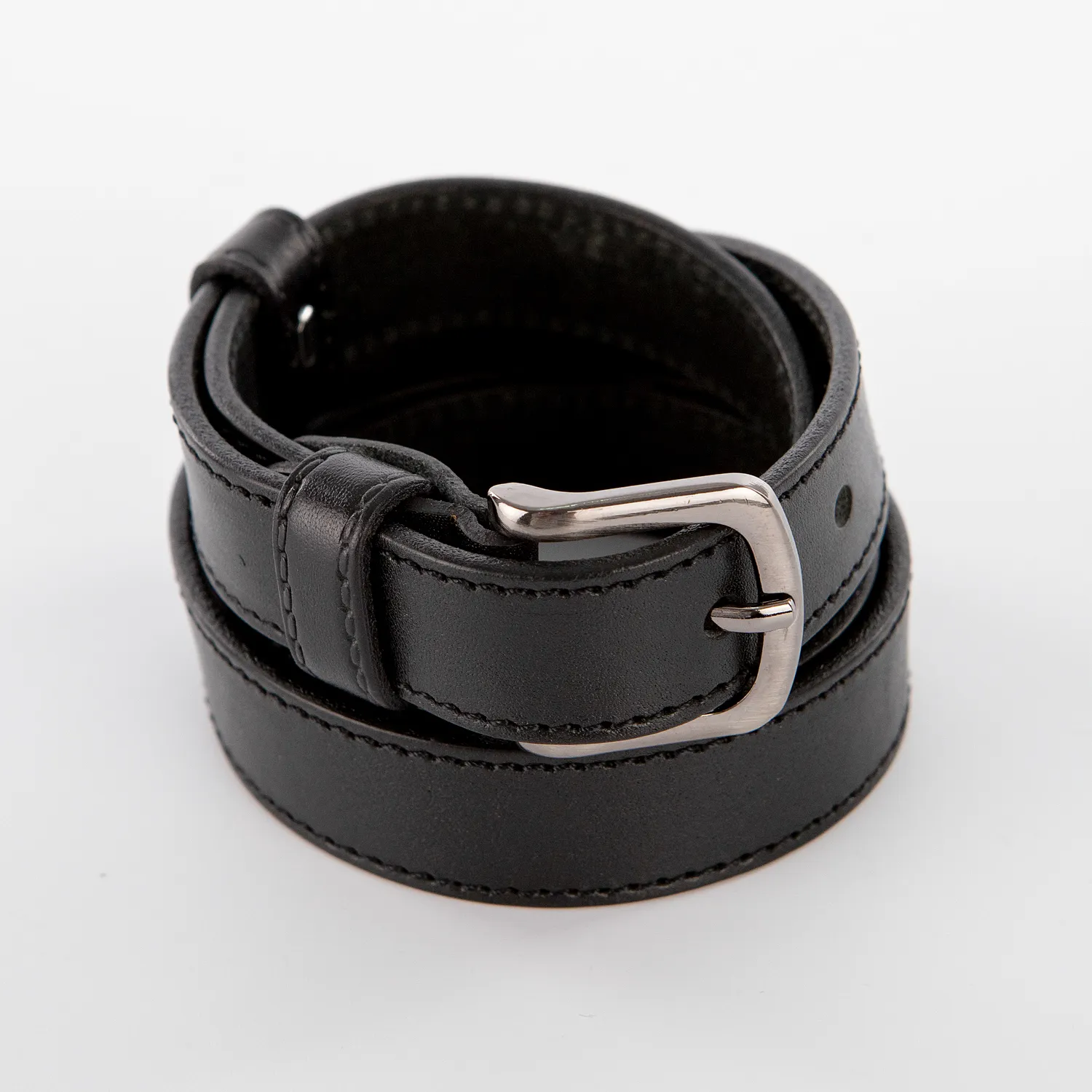 Женский ремень от торговой марки Poshete из натуральной кожи черного цвета. Модель с металлической пряжкой и двумя шлевками; ширина - 25 мм, длина – 95-125 см.