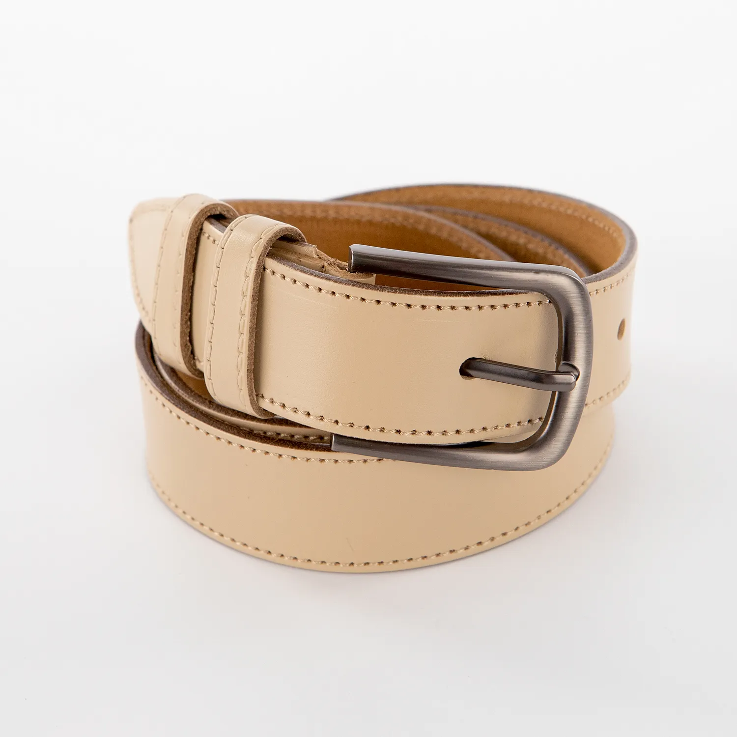 Ремень от торговой марки Koppel из натуральной кожи бежевого цвета. Модель с металлической пряжкой с двумя шлевками; края прострочены; ширина - 35 мм, длина – 95-125 см.