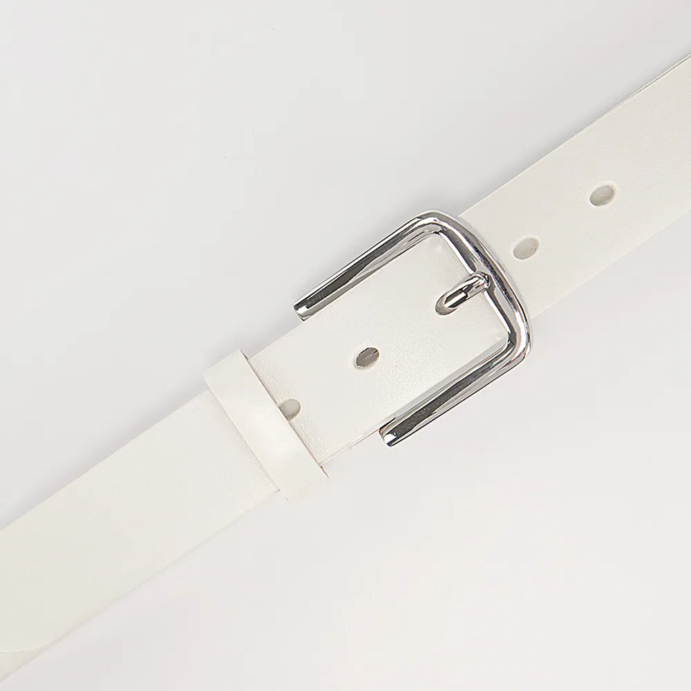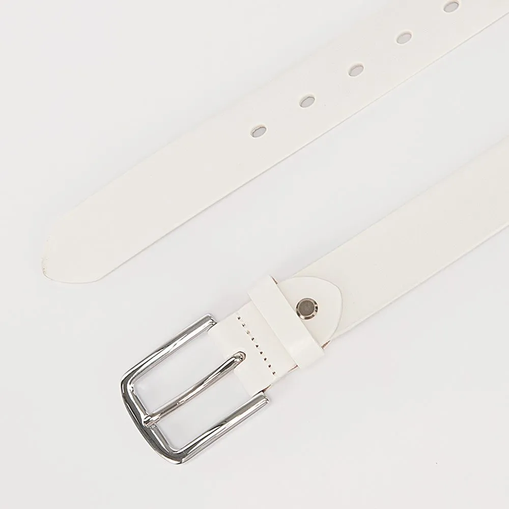 Женский ремень от торговой марки Poshete из натуральной кожи белого цвета. Модель длиной 106-110 см, шириной 3,5 см. Металлическая пряжка; шлевка для фиксации.