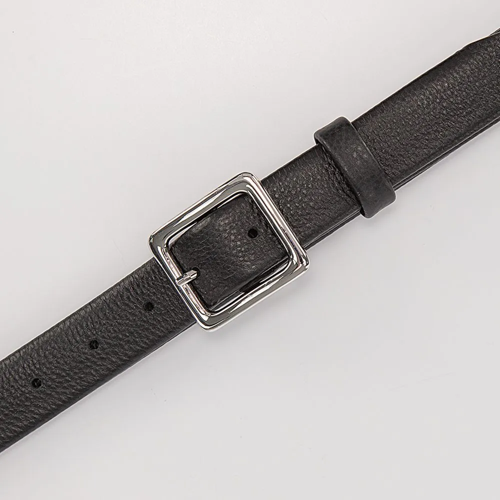 Женский ремень от торговой марки Poshete из натуральной зернистой кожи черного цвета. Модель с квадратной металлической пряжкой. Ширина – 3 см, длина – 115 см. Размер: L.