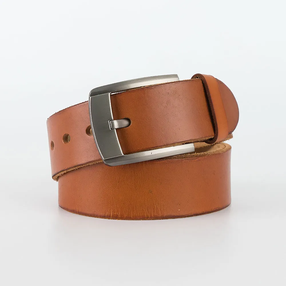 Стильный мужской ремень от бренда Poshete выполнен из натуральной толстой кожи, с оборотной стороны замшевый. Ремень коричневого цвета, ширина 4 см, длина 105-110 см. Стальная квадратная пряжка с «язычком», одна шлёвка и классические отверстия для фиксации объёма, на конце овальной формы.