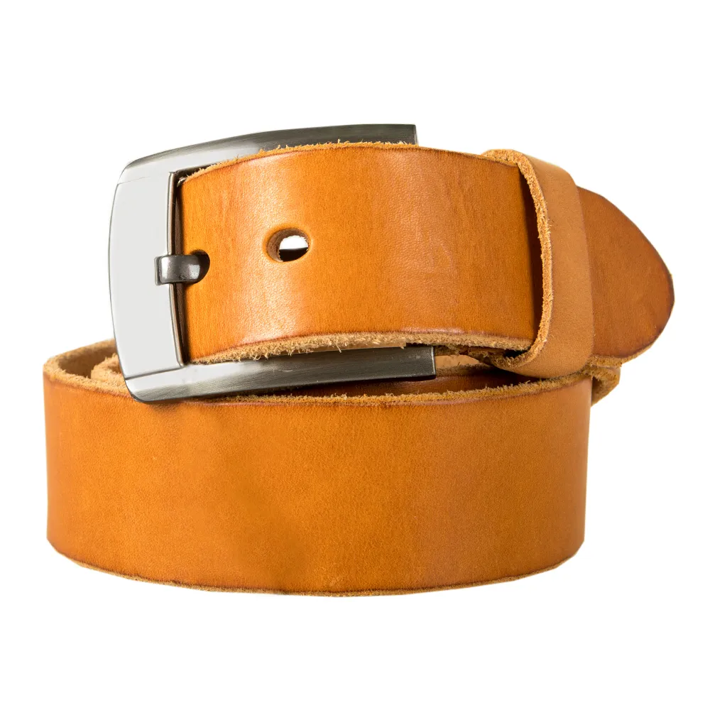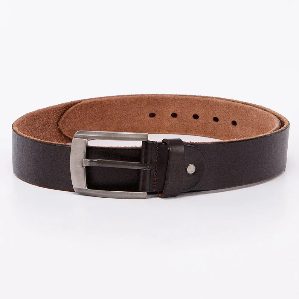 Стильный мужской ремень от бренда Poshete выполнен из натуральной толстой кожи, с оборотной стороны замшевый. Ремень коричневого цвета, ширина 4 см, длина 105-110 см. Стальная квадратная пряжка с «язычком», одна шлёвка и классические отверстия для фиксации объёма, на конце овальной формы.