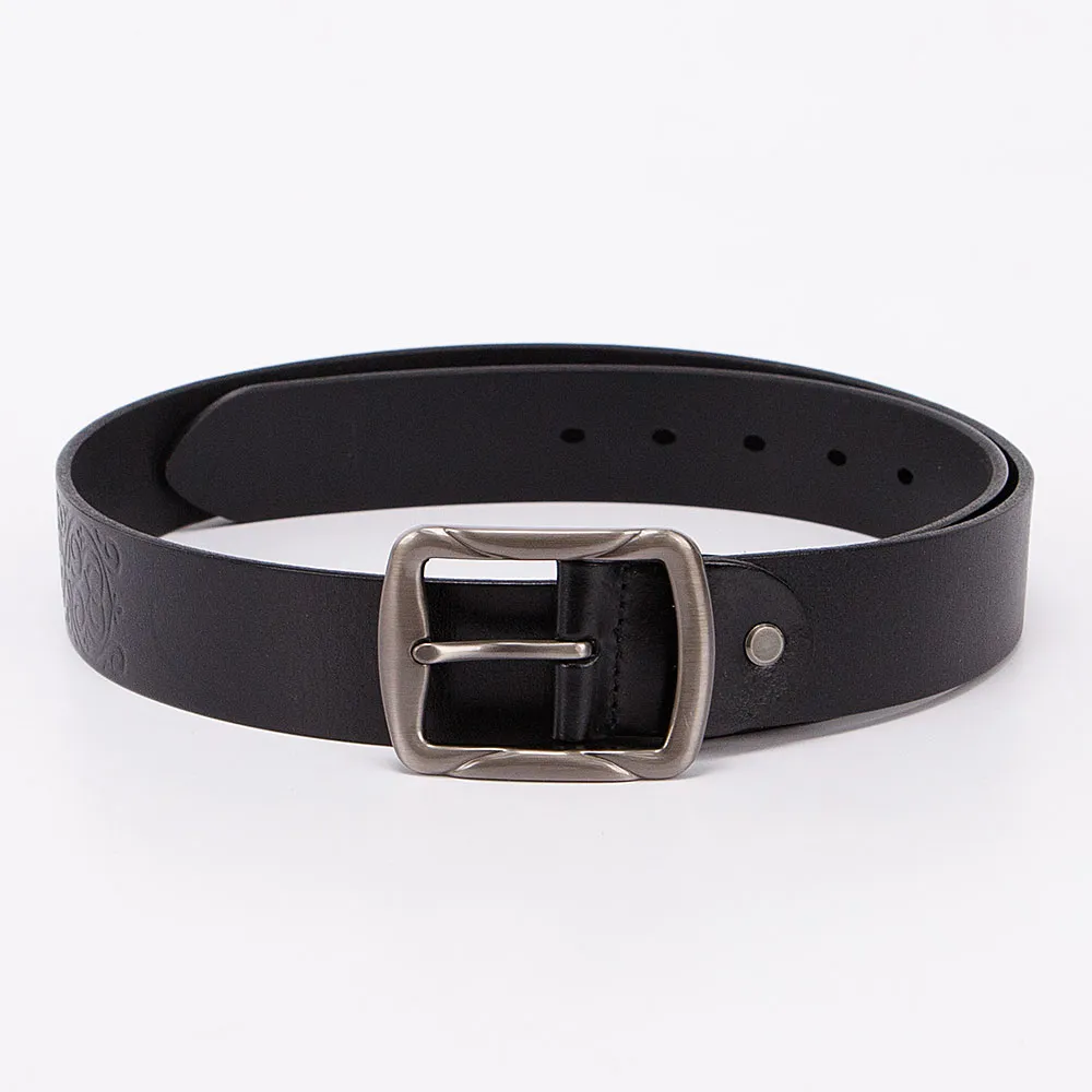 Стильный женский ремень от бренда Poshete выполнен из натуральной толстой кожи и украшен орнаментальным тиснением. Ремень чёрного цвета, ширина 4 см, длина 95-105 см. Стальная квадратная пряжка с «язычком», без шлёвки и классические отверстия для фиксации объёма, на конце овальной формы.