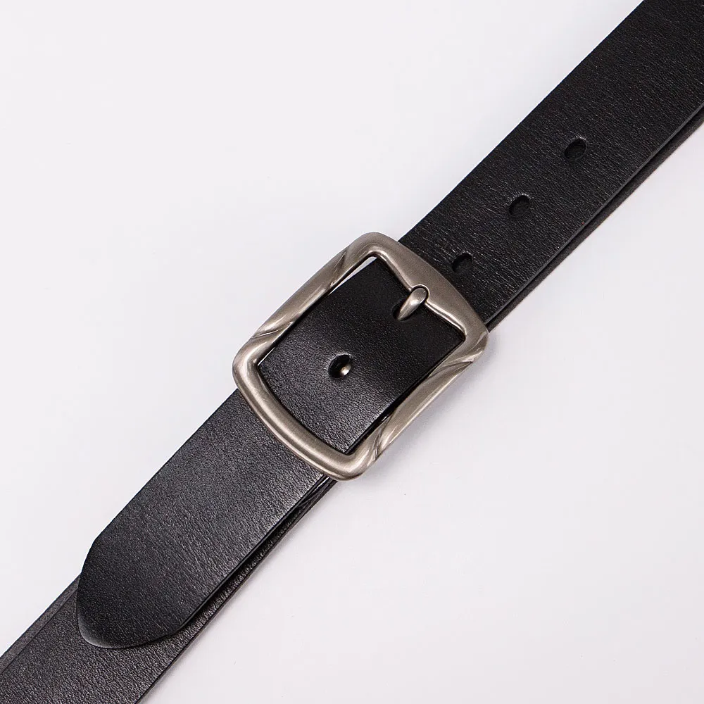 Стильный женский ремень от бренда Poshete выполнен из натуральной толстой кожи и украшен орнаментальным тиснением. Ремень чёрного цвета, ширина 4 см, длина 95-105 см. Стальная квадратная пряжка с «язычком», без шлёвки и классические отверстия для фиксации объёма, на конце овальной формы.