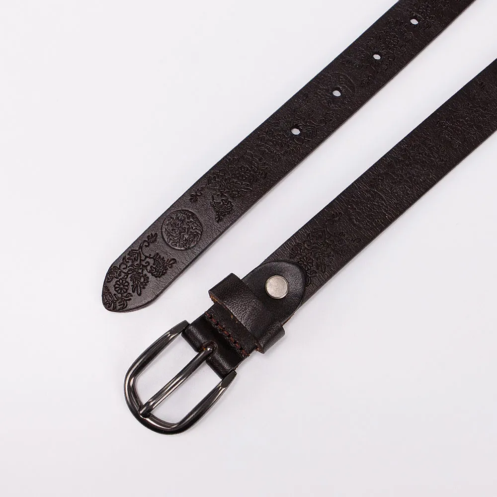 Стильный женский ремень от бренда Poshete выполнен из натуральной толстой кожи и украшен цветочным тиснением. Ремень коричневого цвета, ширина 2,5 см, длина 95-105 см. Стальная овальная пряжка с «язычком», одна шлёвка и классические отверстия для фиксации объёма, на конце овальной формы.