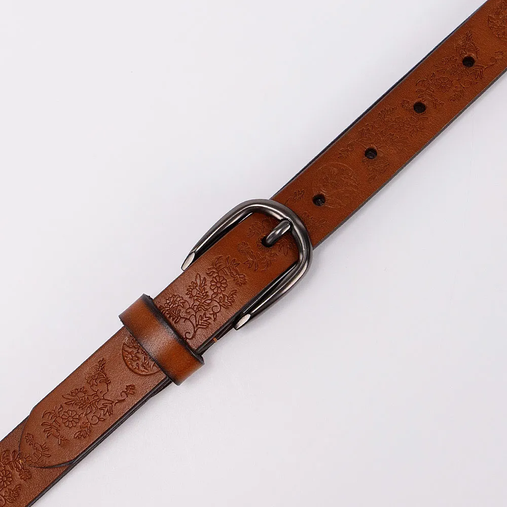 Стильный женский ремень от бренда Poshete выполнен из натуральной толстой кожи и украшен цветочным тиснением. Ремень коричневого цвета, ширина 2,5 см, длина 95-105 см. Стальная овальная пряжка с «язычком», одна шлёвка и классические отверстия для фиксации объёма, на конце овальной формы.