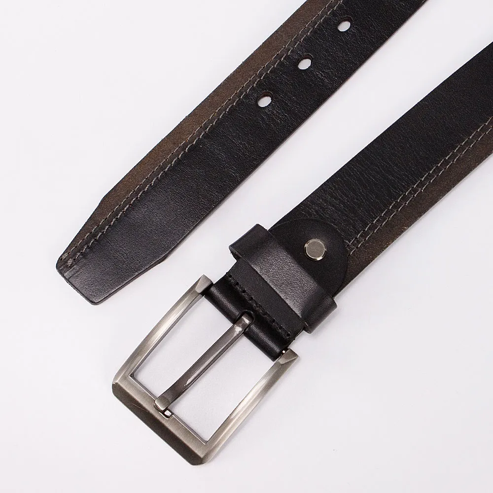 Стильный мужской ремень от бренда Poshete выполнен из натуральной толстой кожи. Ремень чёрного цвета, декорирован двойной строчкой, ширина 3,8 см, длина 105-110 см. Стальная квадратная пряжка с «язычком», одна шлёвка и классические отверстия для фиксации объёма, на конце трапециевидной формы.