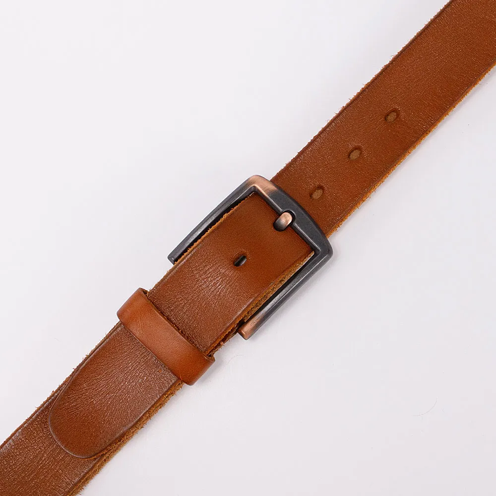 Стильный ремень от бренда Poshete выполнен из натуральной толстой кожи, с оборотной стороны замшевый. Ремень цвета жжёной карамели, ширина 3,8 см, длина 105-110 см. Стальная прямоугольная пряжка с «язычком» выполнена в чёрном цвете с эффектом потёртости, одна шлёвка и классические отверстия для фиксации объёма, на конце овальной формы.