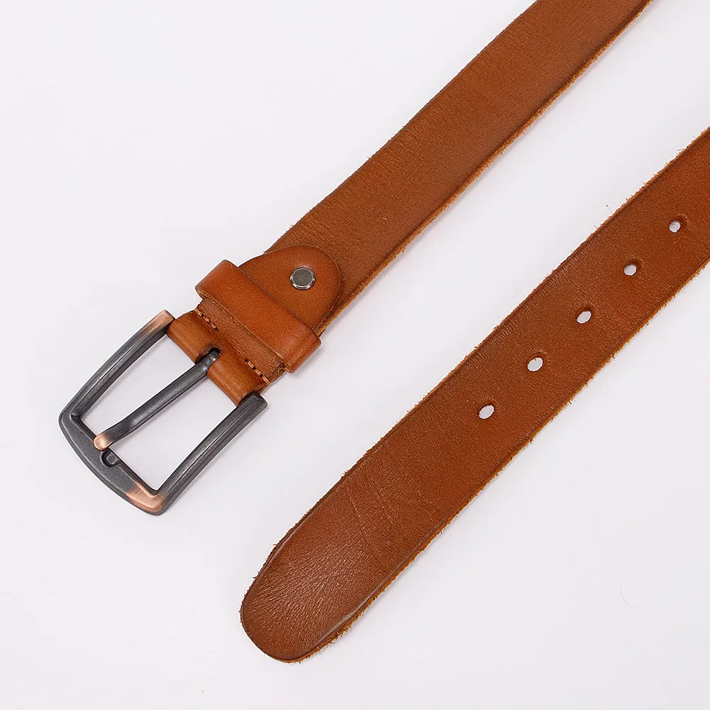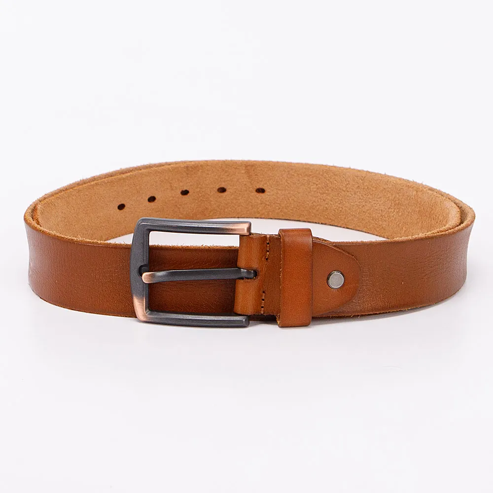 Стильный ремень от бренда Poshete выполнен из натуральной толстой кожи, с оборотной стороны замшевый. Ремень цвета жжёной карамели, ширина 3,8 см, длина 105-110 см. Стальная прямоугольная пряжка с «язычком» выполнена в чёрном цвете с эффектом потёртости, одна шлёвка и классические отверстия для фиксации объёма, на конце овальной формы.