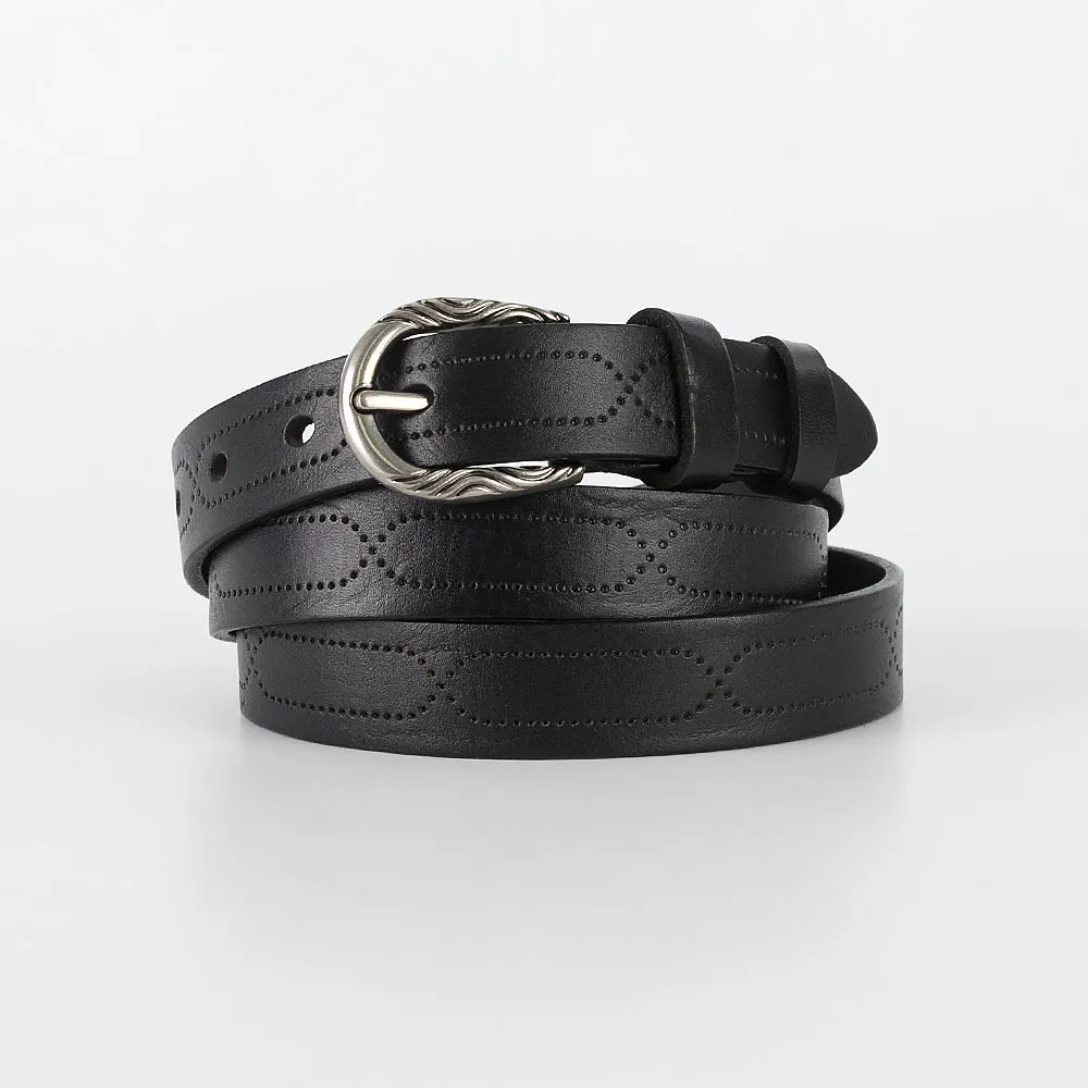 Стильный женский ремень от бренда Poshete выполнен из натуральной гладкой кожи черного цвета. Ширина модели 2,5 см, длина 95-105 см. Оригинальная закругленная пряжка с узором; две шлёвки, классические отверстия для фиксации объёма. Модель декорирована тиснением. Кончик закругленный.