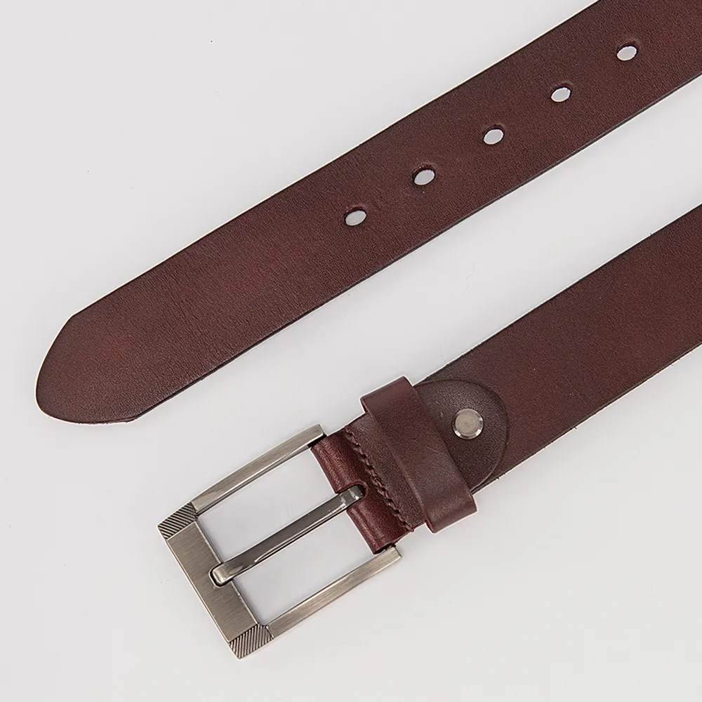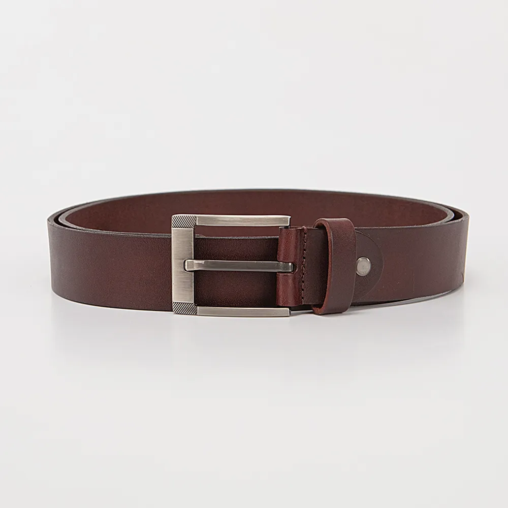 Брючный ремень от бренда Poshete выполнен из натуральной мягкой кожи классического коричневого цвета и дополнен небольшой открытой металлической пряжкой серебристого цвета и кожаной шлевкой.