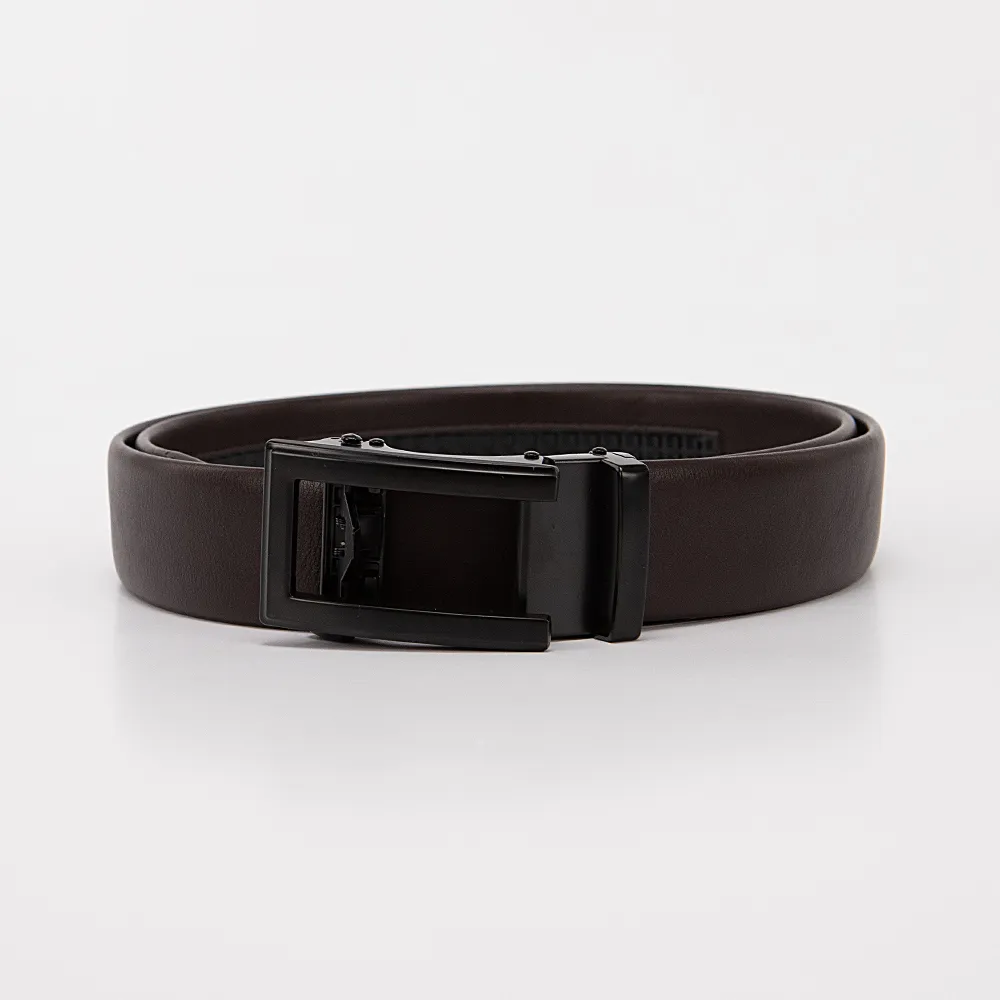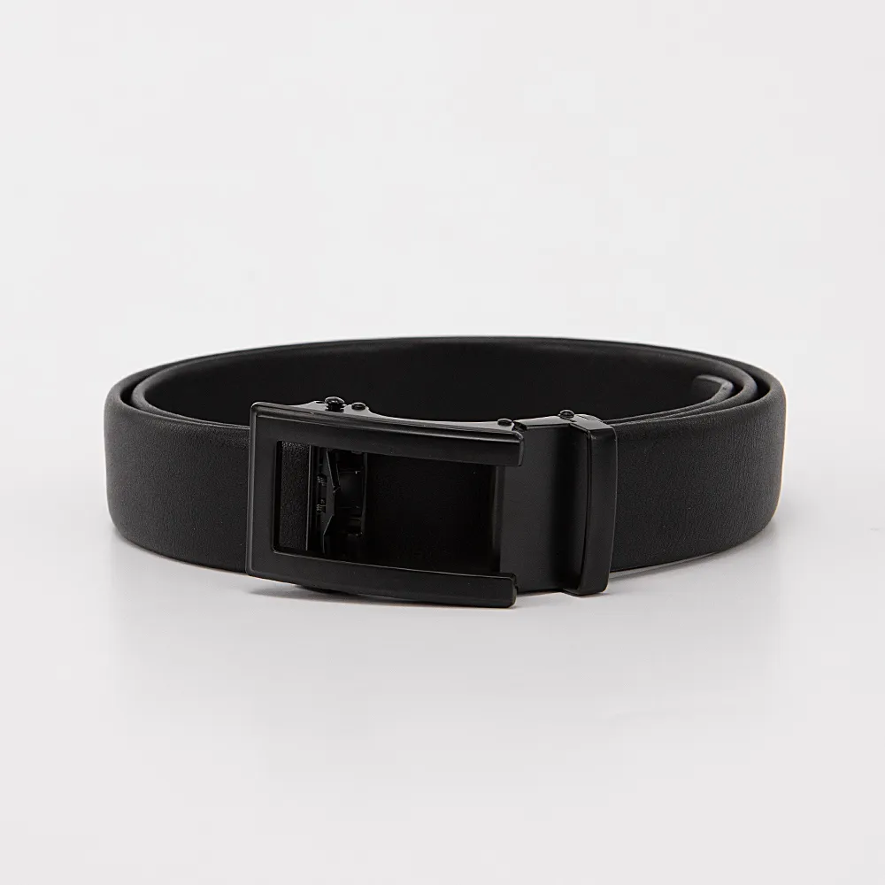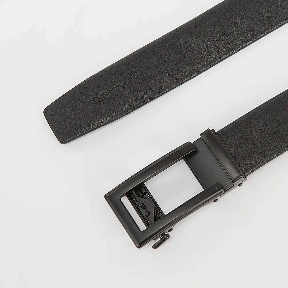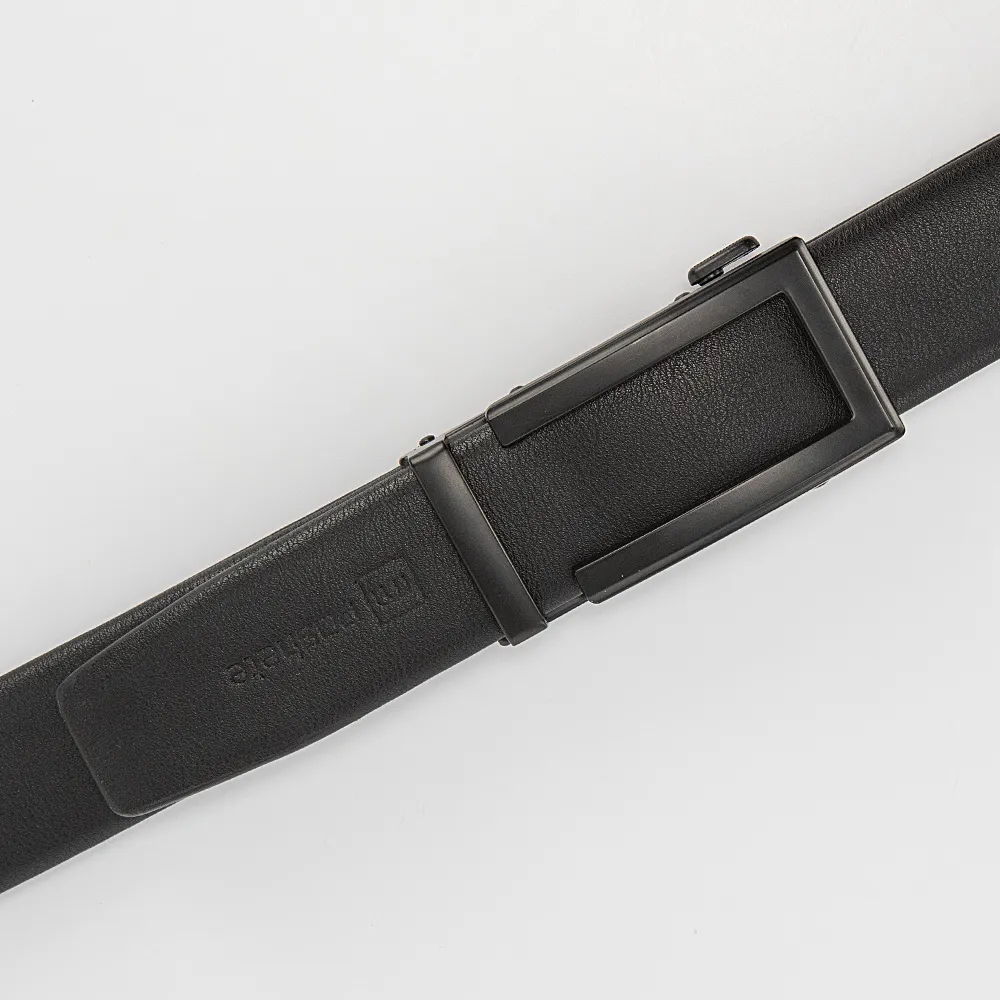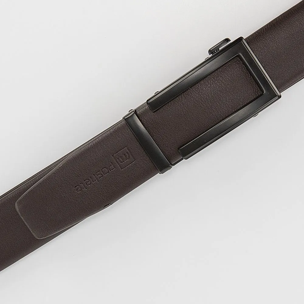 Мужской ремень от торговой марки Poshete из натуральной кожи черного цвета. Модель с металлической пряжкой-автомат цвета титаниум. Ширина: 3,6 см, длина: 105-110 см.