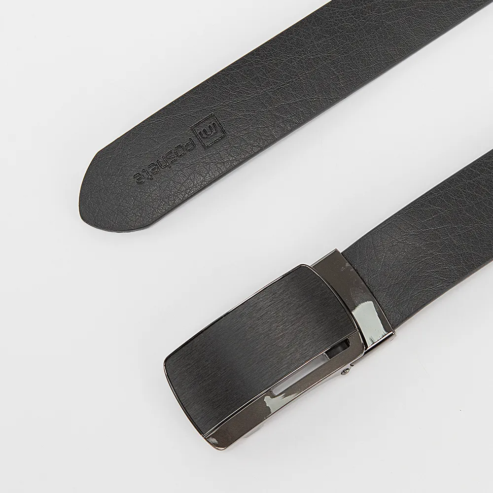 Ремень мужской Poshete выполнен из натуральной кожи в чёрном цвете. Тип застежки - металлическая пряжка автомат с чёрной вставкой и шлёвка. Украшен тиснением логотипа. Имеет ширину 3,5 см. Регулируемый объём 111-115 см.
