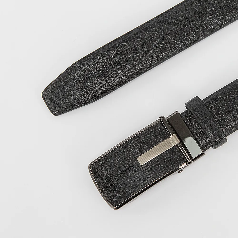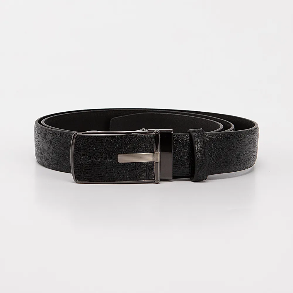 Мужской ремень от торговой марки Poshete из натуральной кожи черного цвета. Модель с пряжкой-автоматом и шлевкой; ширина - 3,5 см, длина - 116-120 см.