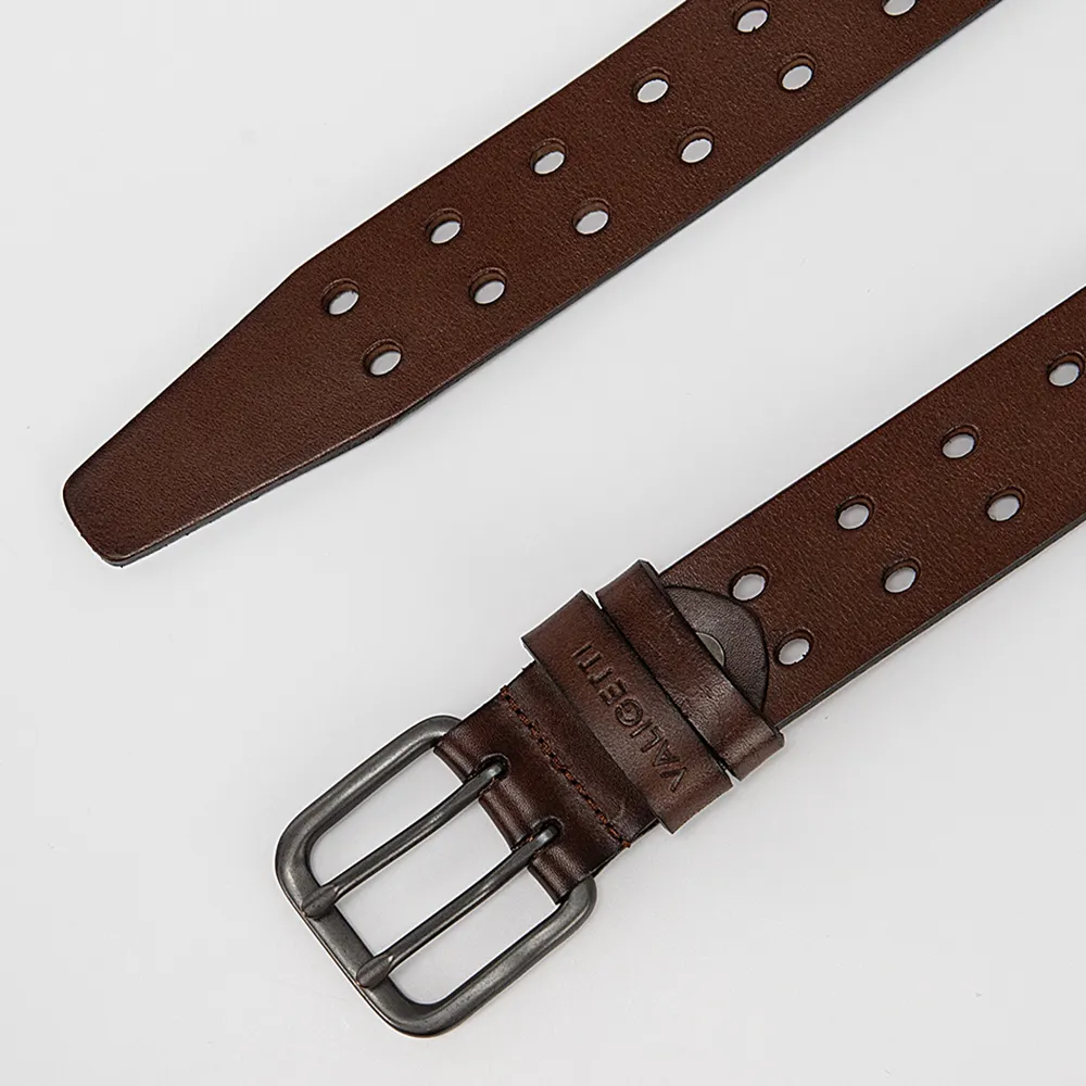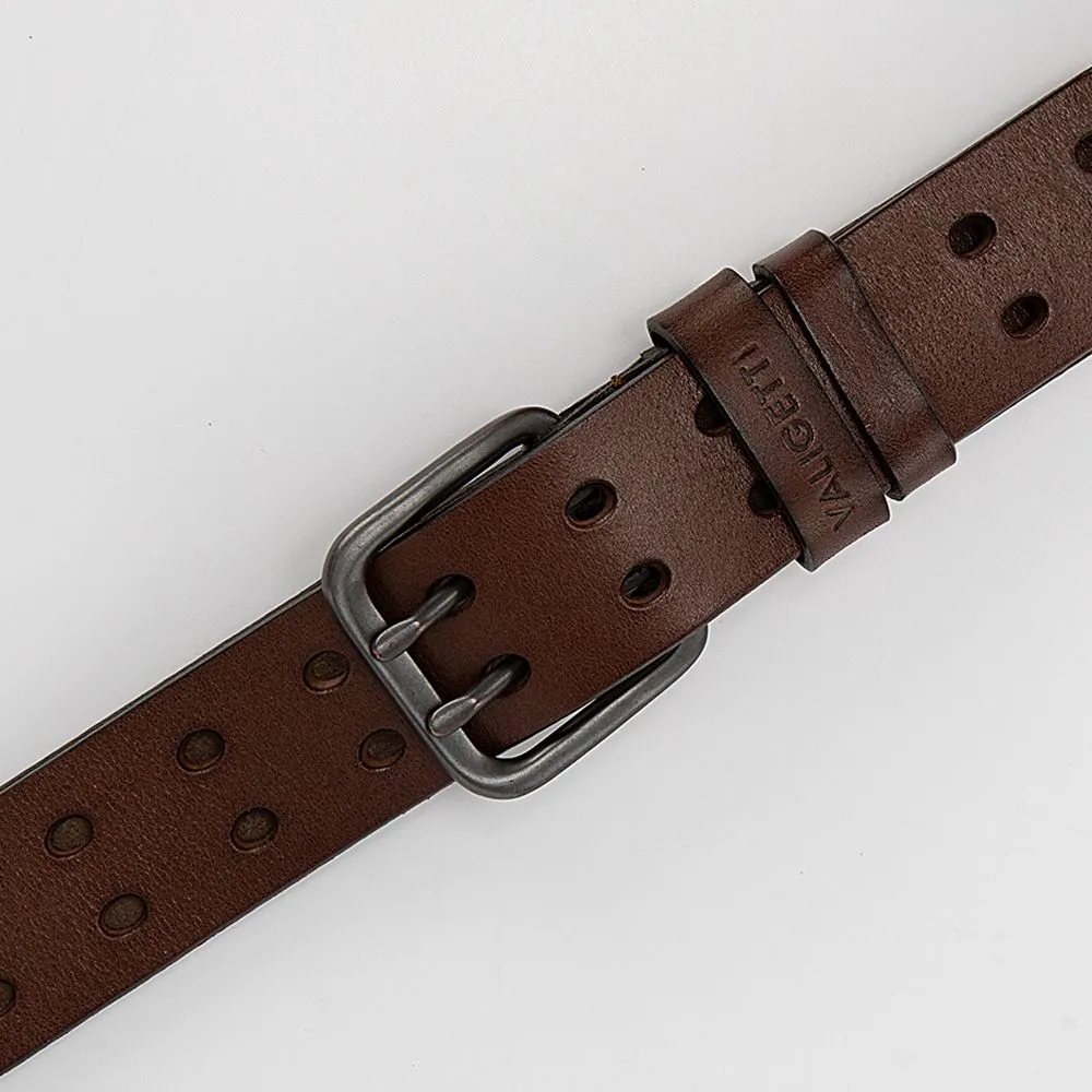 Мужской ремень от торговой марки Valigetti из натуральной кожи коричневого цвета. Модель с металлической пряжкой с двумя язычками и двумя шлевками. Декорирован перфорацией. Ширина – 3,8 см, длина – 120 см. Размер: M.