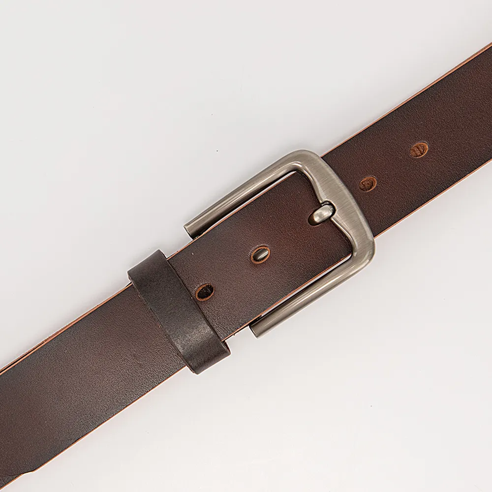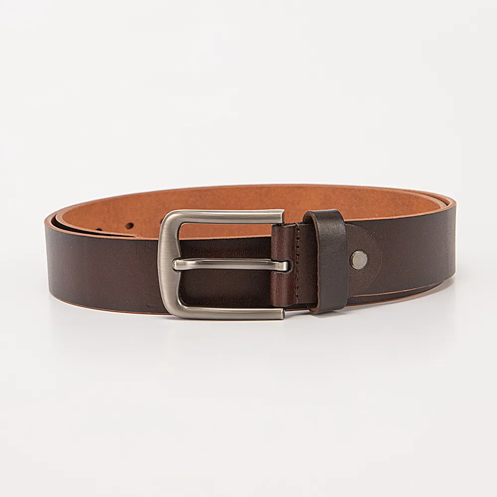 Стильный мужской ремень от бренда Poshete выполнен из натуральной толстой кожи, с оборотной стороны замшевый. Ремень коричневого цвета, ширина 3,8 см, длина 105-110 см. Стальная квадратная пряжка с классическим язычком, шлёвка не перемещается, на ремне пять отверстий для фиксации объёма, на конце полукруглой формы.