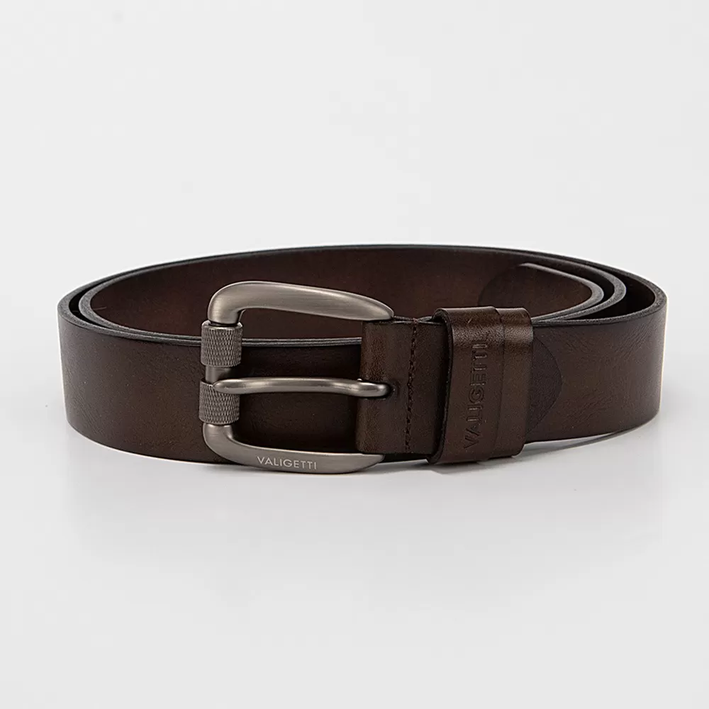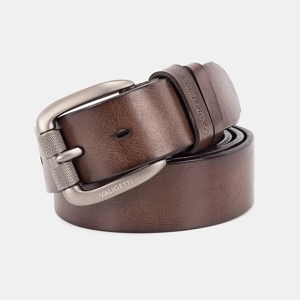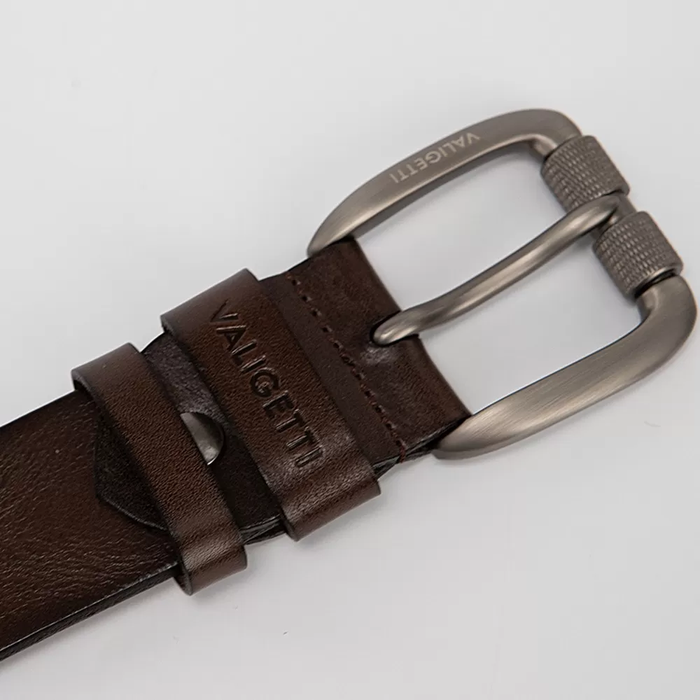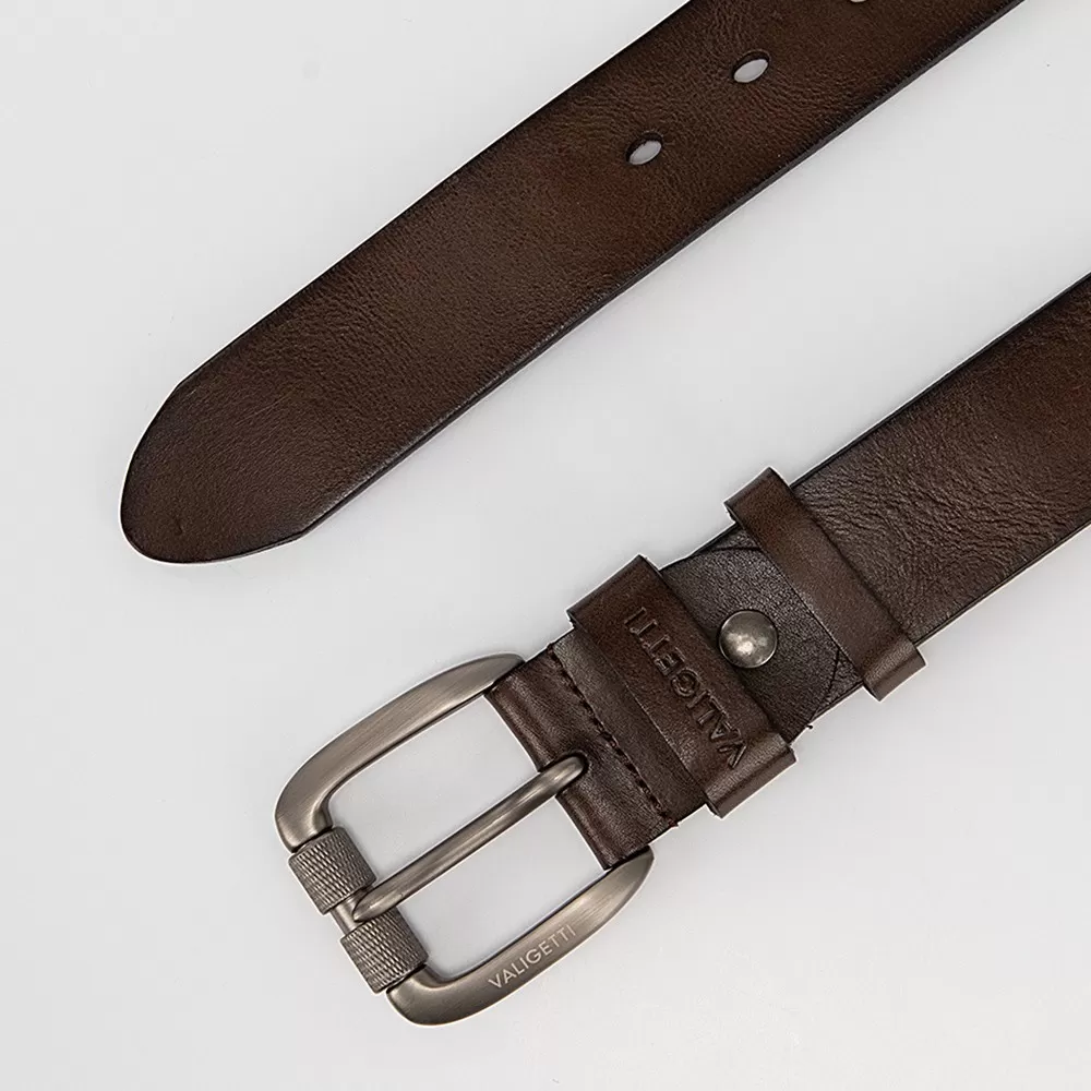 Мужской ремень бренда Valigetti из натуральной кожи коричневого цвета. Пряжка выполнена из металла и имеет матовую поверхность. Ремень оснащён двумя шлёвками. Ширина ремня — 3,8 см, длина — 130 см. Размер ремня: L.