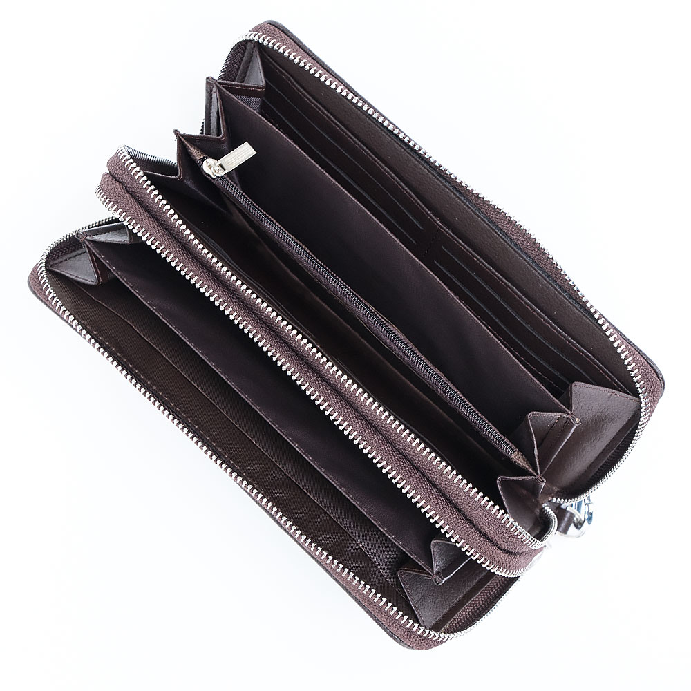 Большой мужской клатч от бренда Poshete тёмно-коричневого цвета, выполнен из искусственной матовой кожи. Имеет два основных отделения на металлических молниях, расстёгивающихся по трём сторонам. Внутри каждого - отделения для купюр и отделения на молнии для монет. Сзади удобный, плотно прилегающий ремешок для ладони.
