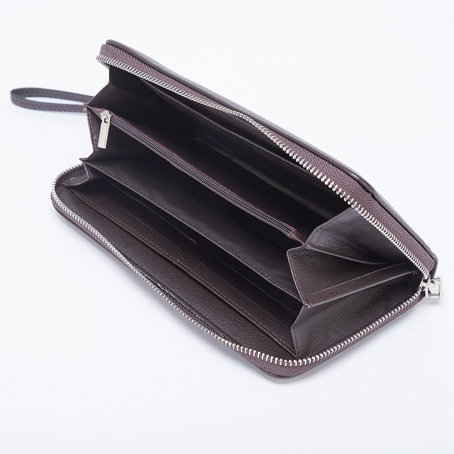 Большой мужской клатч от торговой марки Poshete выполнен из искусственной матовой кожи коричневого цвета. Модель со съемным ремешком для запястья. Отделение на молнии по трем сторонам. Внутри: четыре отделения для купюр, карманы для карт, средник на молнии для монет. На задней стороне - лямка для ношения на тыльной стороне ладони.