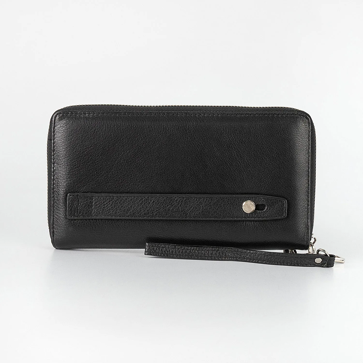 Мужской клатч от бренда Poshete чёрного цвета, выполнен из натуральной матовой кожи. Застёгивается на металлическую молнию, которая идёт по трём сторонам. Внутри четыре отделения для купюр, средник на молнии для монет и кармашки для пластиковых карт. Снаружи удобный, плотно прилегающий ремешок для ладони и короткий ремешок для запястья.