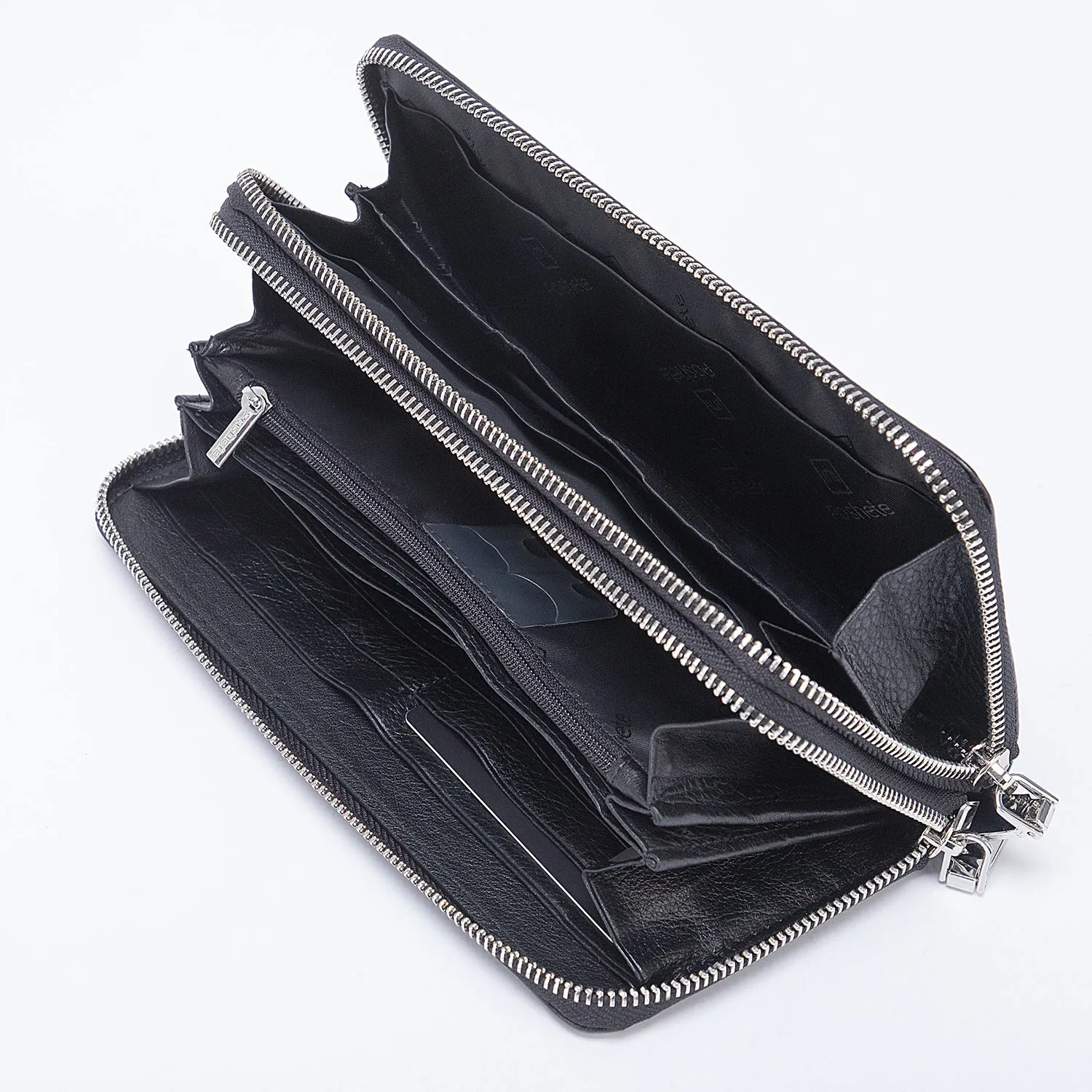 Мужской клатч от бренда Poshete чёрного цвета, выполнен из натуральной кожи. Имеет два независимых отделения на металлических молниях, молнии расстёгиваются по трём сторонам. Внутри отделения для купюр, карман на молнии для монет и кармашки для пластиковых карт.