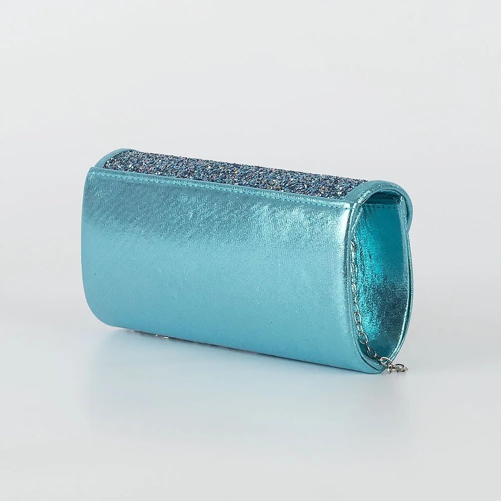 Элегантный клатч от бренда Passo Avanti выполнен из текстильного материала голубого цвета с эффектом металлик. Жесткая модель в форме футляра, со съемной серебристой цепочкой. Закрывается клапаном на магнитной кнопке. Клапан декорирован мерцающими блестками. Внутри: текстильная подкладка и накладной карман.
