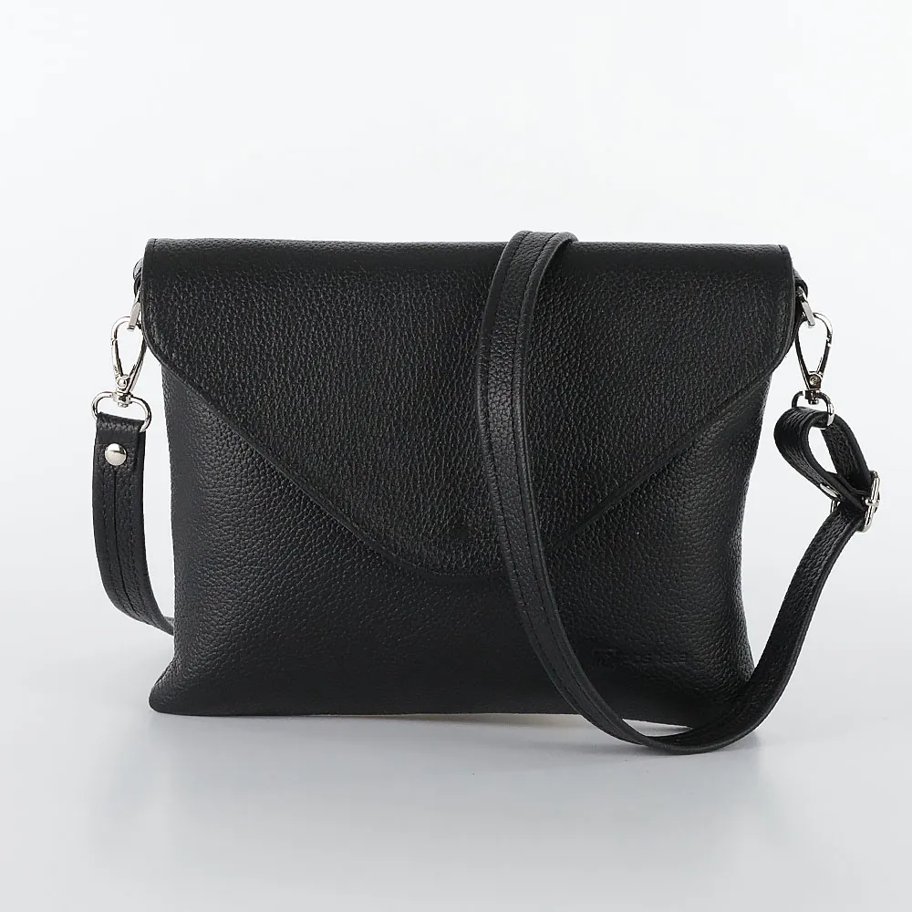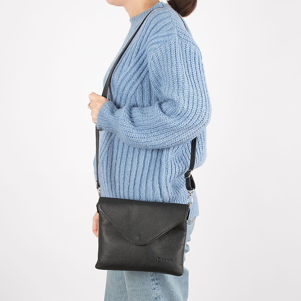 Сумка-клатч от торговой марки Poshete из натуральной кожи черного цвета. Плоская модель со съемным регулируемым плечевым ремнем. Закрывается треугольным клапаном на магнитной кнопке. Отделение на молнии. Внутри: фирменная подкладка, карман на молнии, накладной карман. На задней стороне – карман на скрытой молнии.