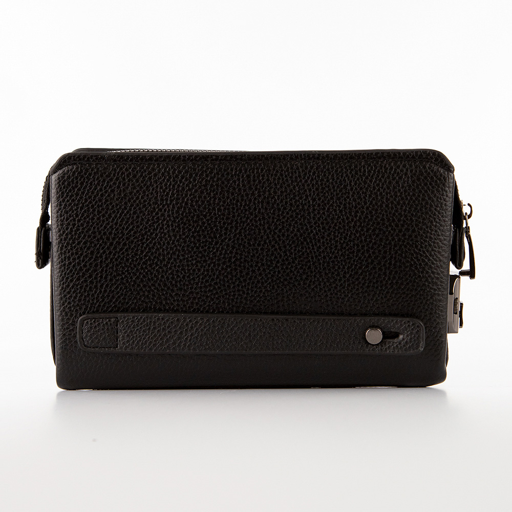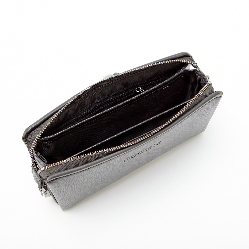 Клатч от торговой марки Poshete из искусственной кожи черного цвета. Модель с лямкой для ношения на запястье. Отделение на молнии. Молния крепится по бокам на кнопку; имеется кодовый замок. Внутри: две плотных перегородки, разделяющих на три отсека с карманом на молнии, карманами для карт и документов.