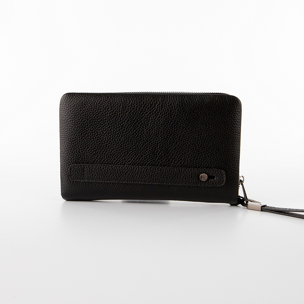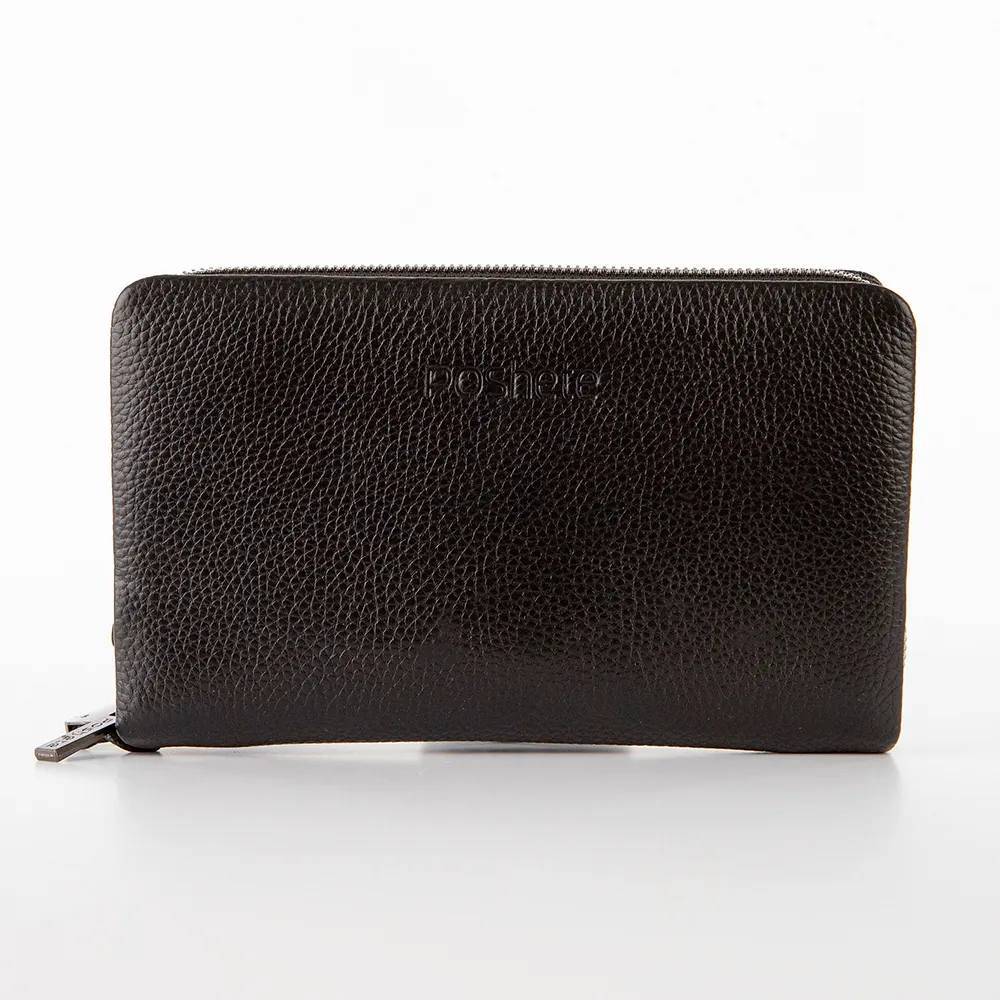 Клатч от торговой марки Poshete из искусственной кожи черного цвета. Модель со съемным ремешком для запястья и лямкой для фиксации на ладони и запястье, расположенной на задней стороне. Два отделения на молнии. Внутри: карманы для карт и документов, карман на молнии.