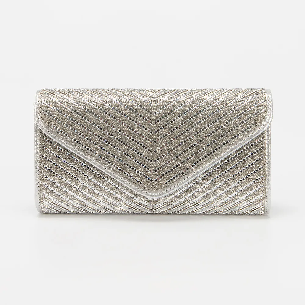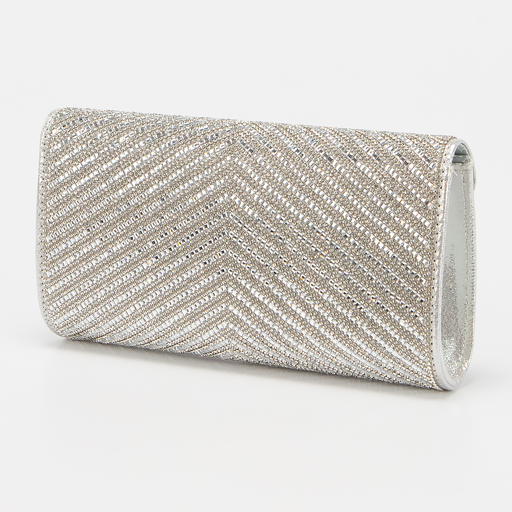 Клатч от торговой марки Passo Avanti. Модель серебряного цвета; декорирована стразами и стеклярусом. Закрывается клапаном на магнитной кнопке; имеется съемная цепочка. Внутри: текстильная подкладка, накладной карман.