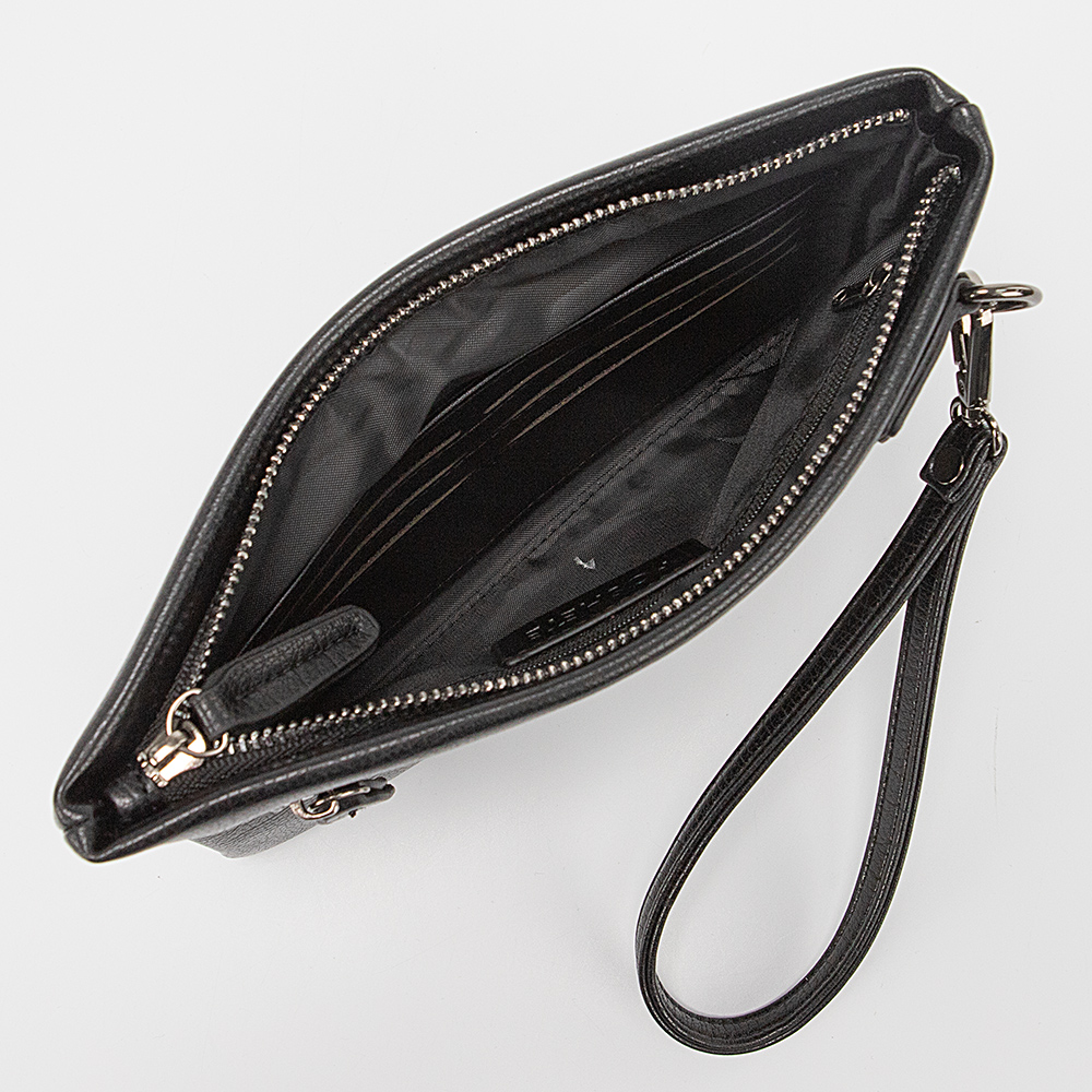 Клатч от торговой марки Poshete из искусственной кожи черного цвета. Модель со съемным ремешком для запястья. Отделение на молнии. Внутри: фирменная подкладка, карман на молнии, накладной карман с прорезями для карт. На задней стороне – карман на молнии.