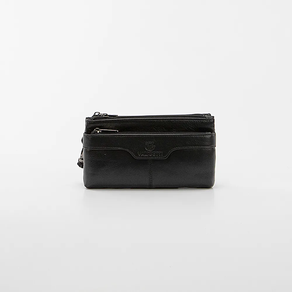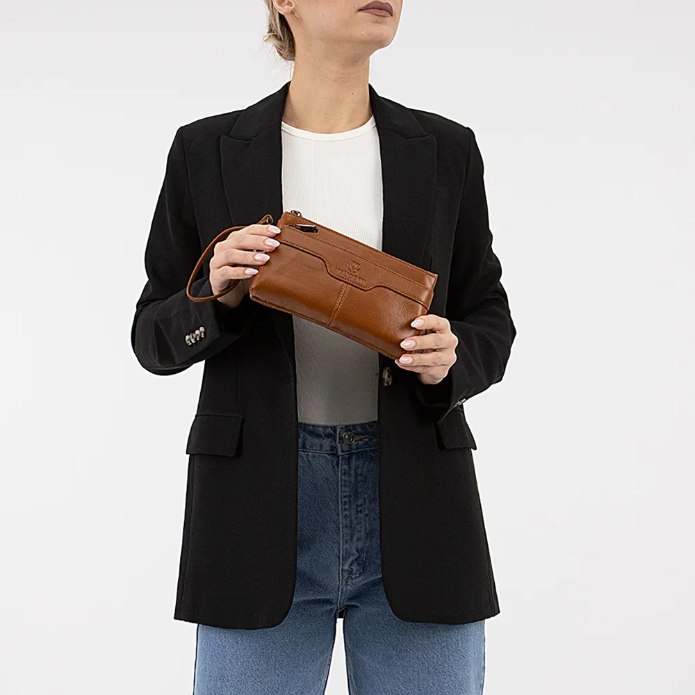 Клатч от торговой марки Valigetti из натуральной кожи цвета dark camel. Модель со съемным ремешком для запястья и съемным регулируемым плечевым ремнем. Три отделения с фирменной подкладкой. Крайние отделения закрываются молнией; в переднем – карманы для карт. Среднее отделение фиксируется магнитной кнопкой. На лицевой и задней сторонах – карман на молнии.