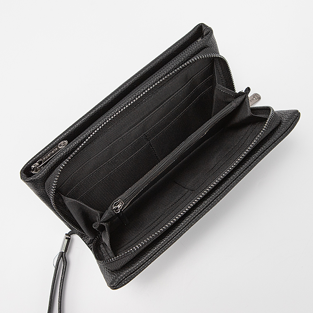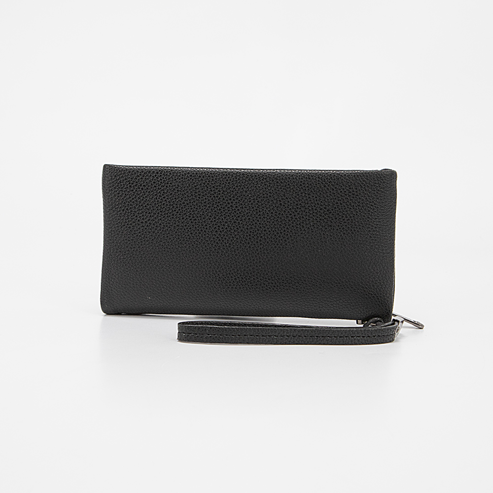 Клатч от торговой марки Poshete из искусственной кожи черного цвета. Модель со съемной ручкой для запястья. Два отделения на молнии; в одном из них – карманы для карт и купюр, карман-перегородка на молнии.