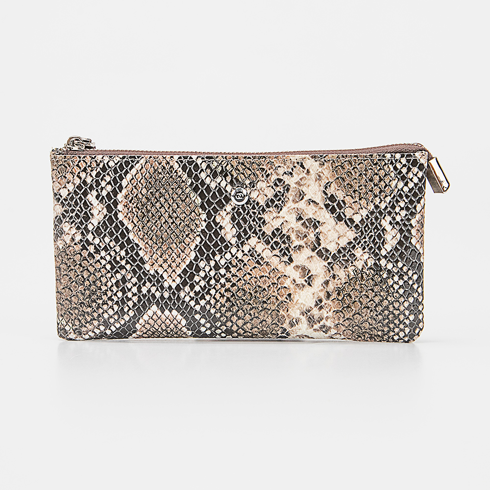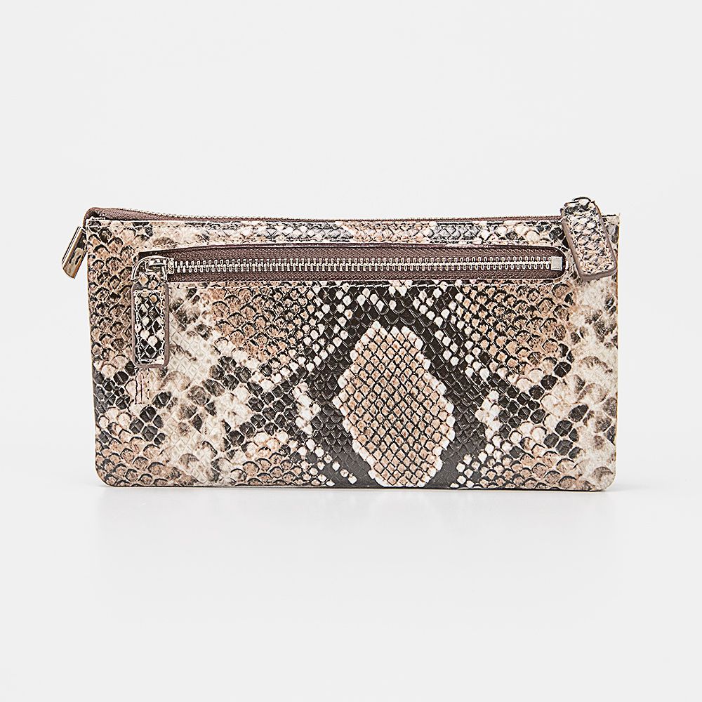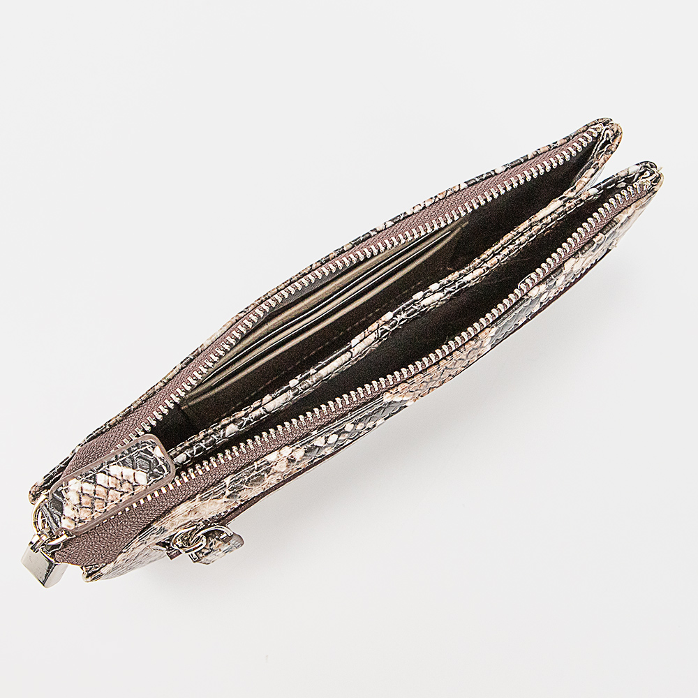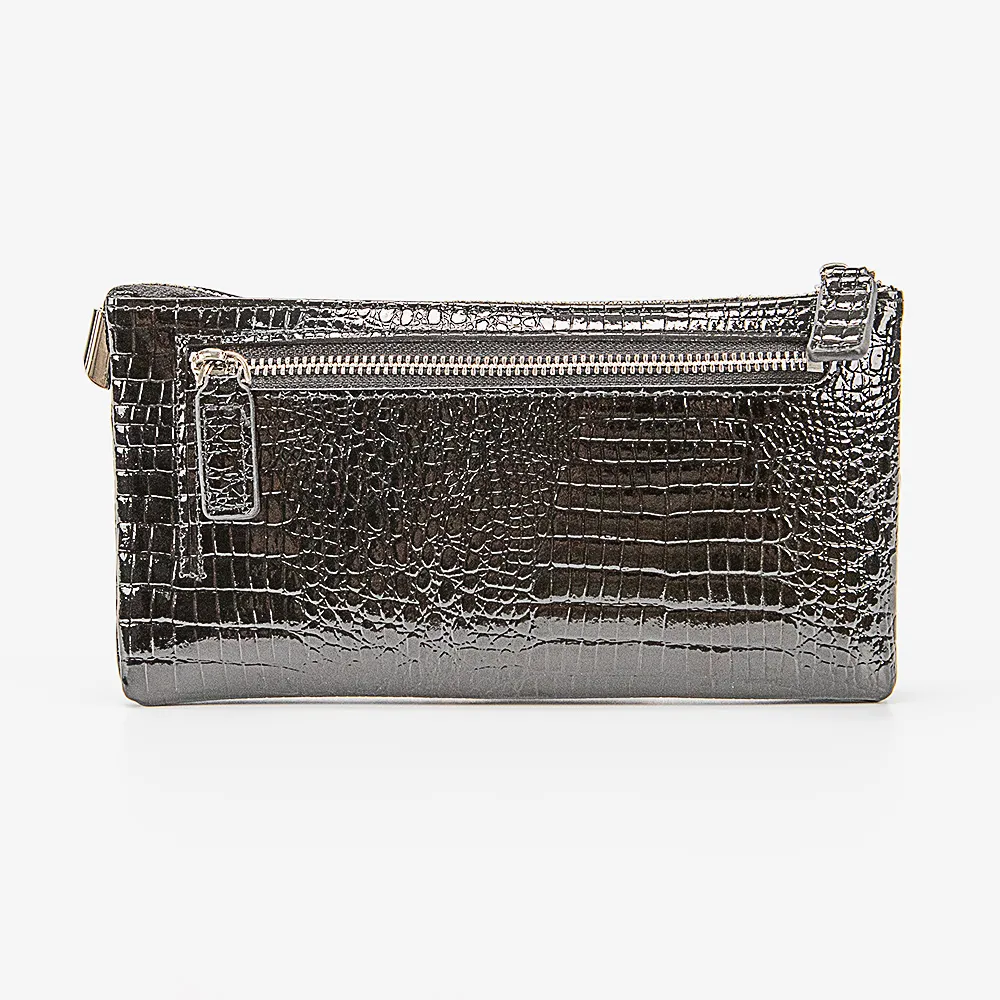 Клатч от торговой марки Francesco Molinary из натуральной лакированной кожи черного цвета с тиснением под рептилию. Модель со съемным ремешком для запястья. Закрывается молнией. Внутри: два отсека, в одном из которых – карманы для карт, в другом – карман на молнии. На задней стороне – карман на молнии.