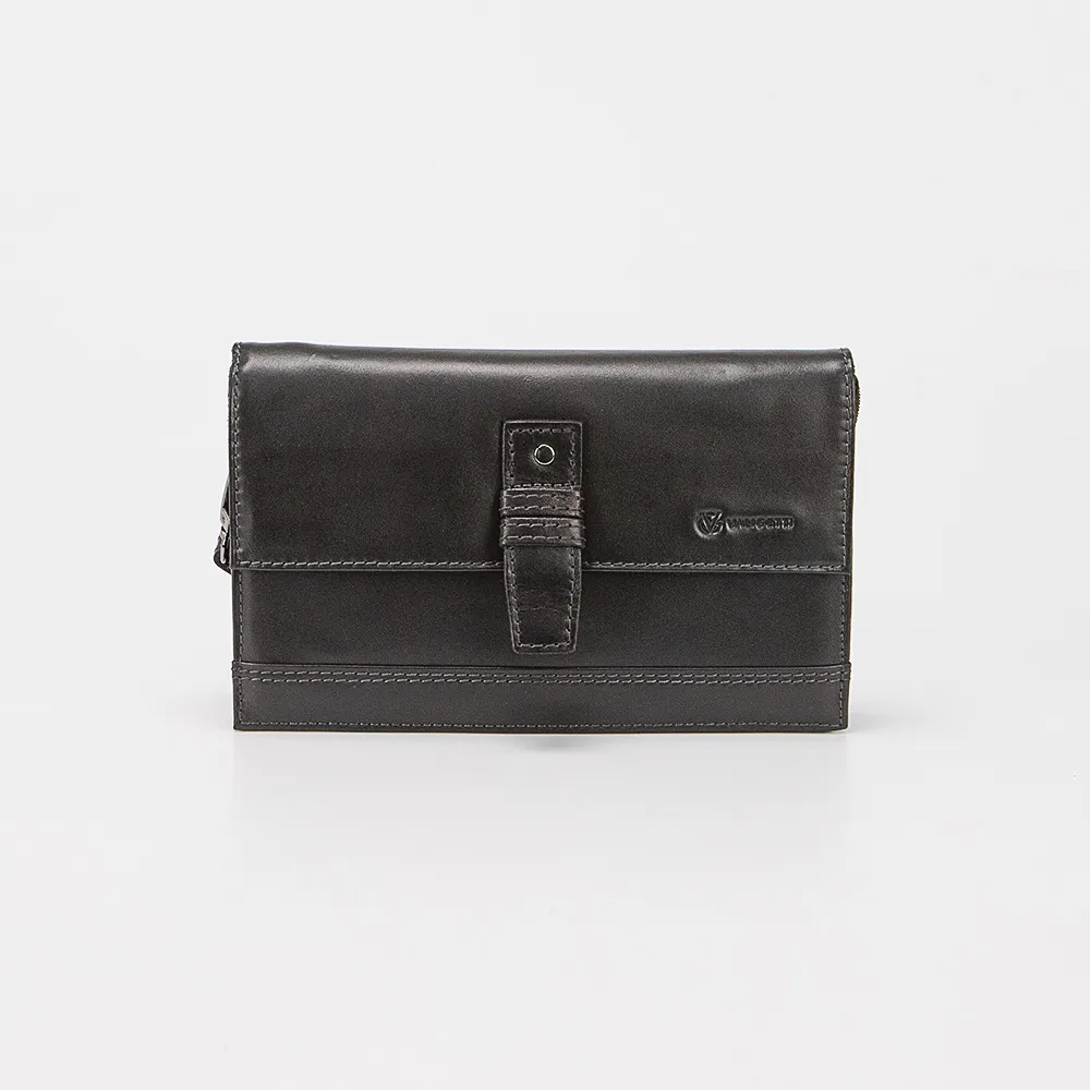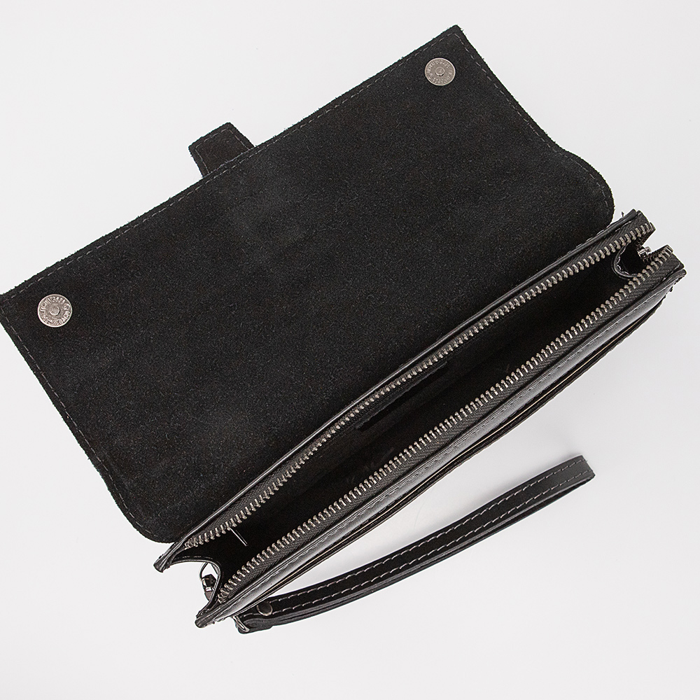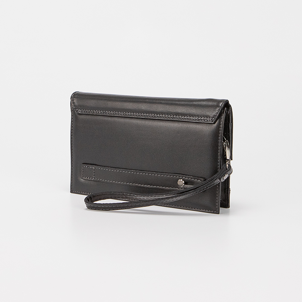 Клатч от торговой марки Valigetti из натуральной кожи. Модель с ремешком для запястья. Закрывается клапаном на двух магнитных кнопках; клапан декорирован ремешком с пряжкой. Отделение на молнии. На задней стенке – ремешок для ношения на ладони.
