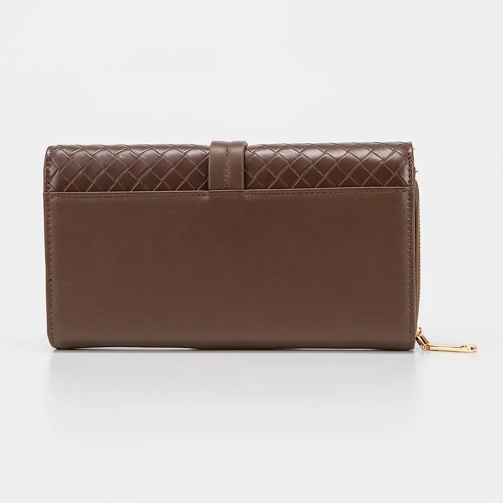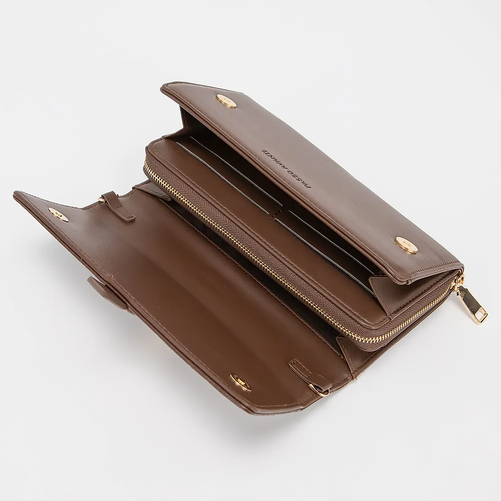Клатч от торговой марки Passo Avanti из искусственной кожи коричневого цвета. Модель закрывается клапаном на магнитных кнопках. Внутри отделение на молнии, карманы для карт, отделения для купюр.Снаружи декорирован хлястиком с позолоченной пряжкой.