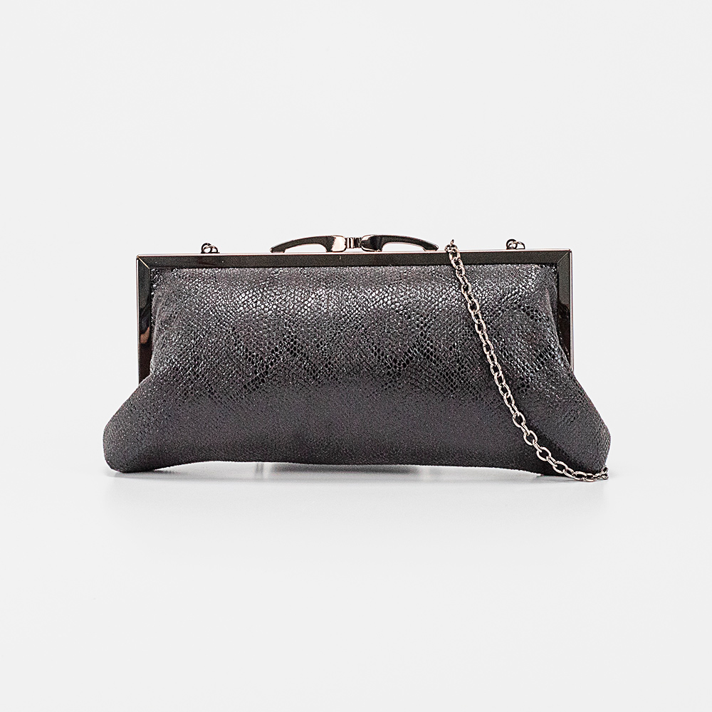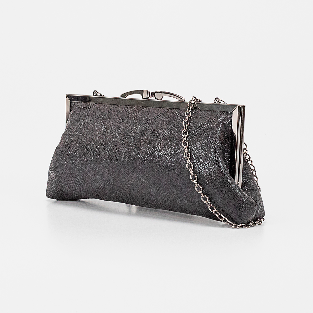 Клатч от торговой марки Marzia из искусственной кожи серебряного цвета с эффектной лазерной обработкой и тиснением под рептилию. Модель со съемным плечевым ремнем-цепочкой. Имеет рамочный вид закрытия фермуар. Внутри отделения: фирменная подкладка, накладной карман.