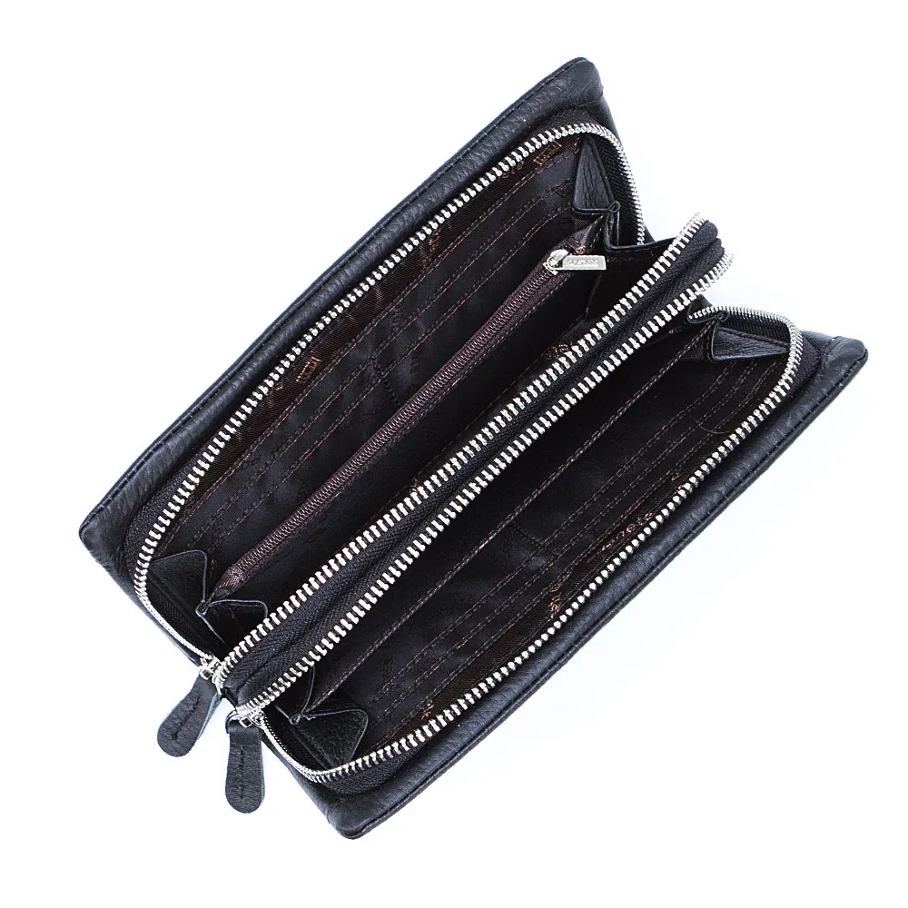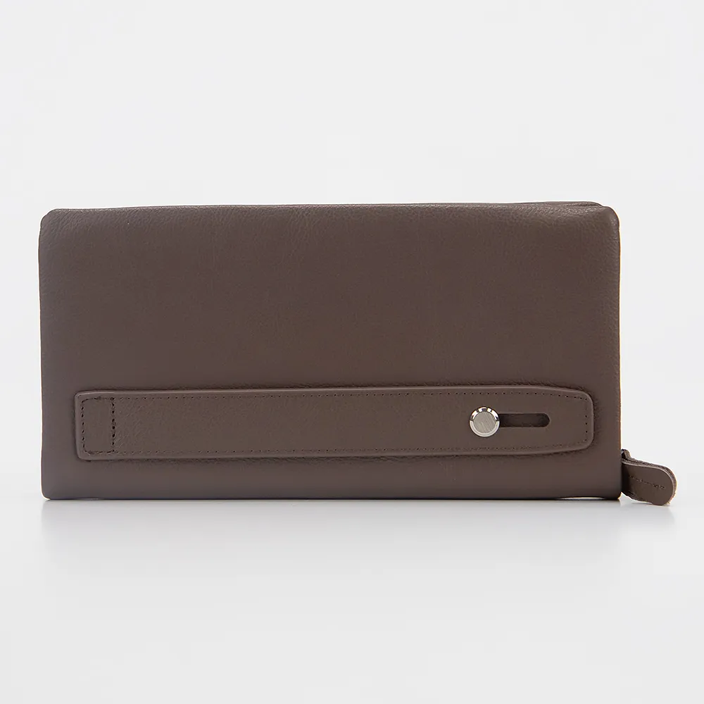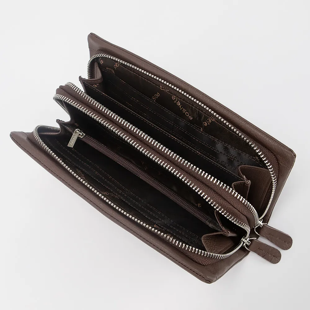 Кошелек-клатч от торговой марки Poshete из натуральной кожи кофейного цвета. Модель с двумя отделениями на молнии. В одном отделении - карман на молнии, карманы для карт, в другом - перегородки, отделения для купюр. На задней стороне имеется ремешок для запястья.