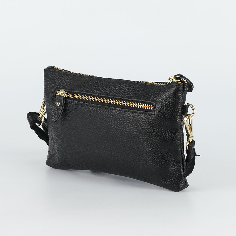 Сумка-клатч от торговой марки Poshete из натуральной зернистой кожи черного цвета. Плоская модель со съемным регулируемым плечевым ремнем. Отделение на молнии. Внутри: фирменная подкладка, карман на молнии, перегородка с карманом на молнии. На лицевой и задней сторонах – карман на молнии.